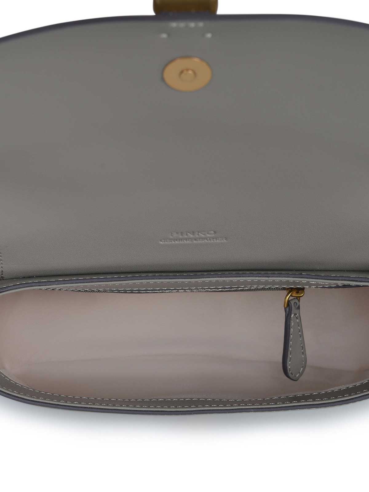 Mini-sac de selle Pinko en cuir couleur mue. fermeture à rabat. détail métallique personnalisé avec logo. poche murale avec fermeture zippée. bandoulière en cuir. inserts métalliques avec nœuds et pointes sphériques. hauteur : 15 cm largeur : 7 cm longueur : 22 cm 100% cuir