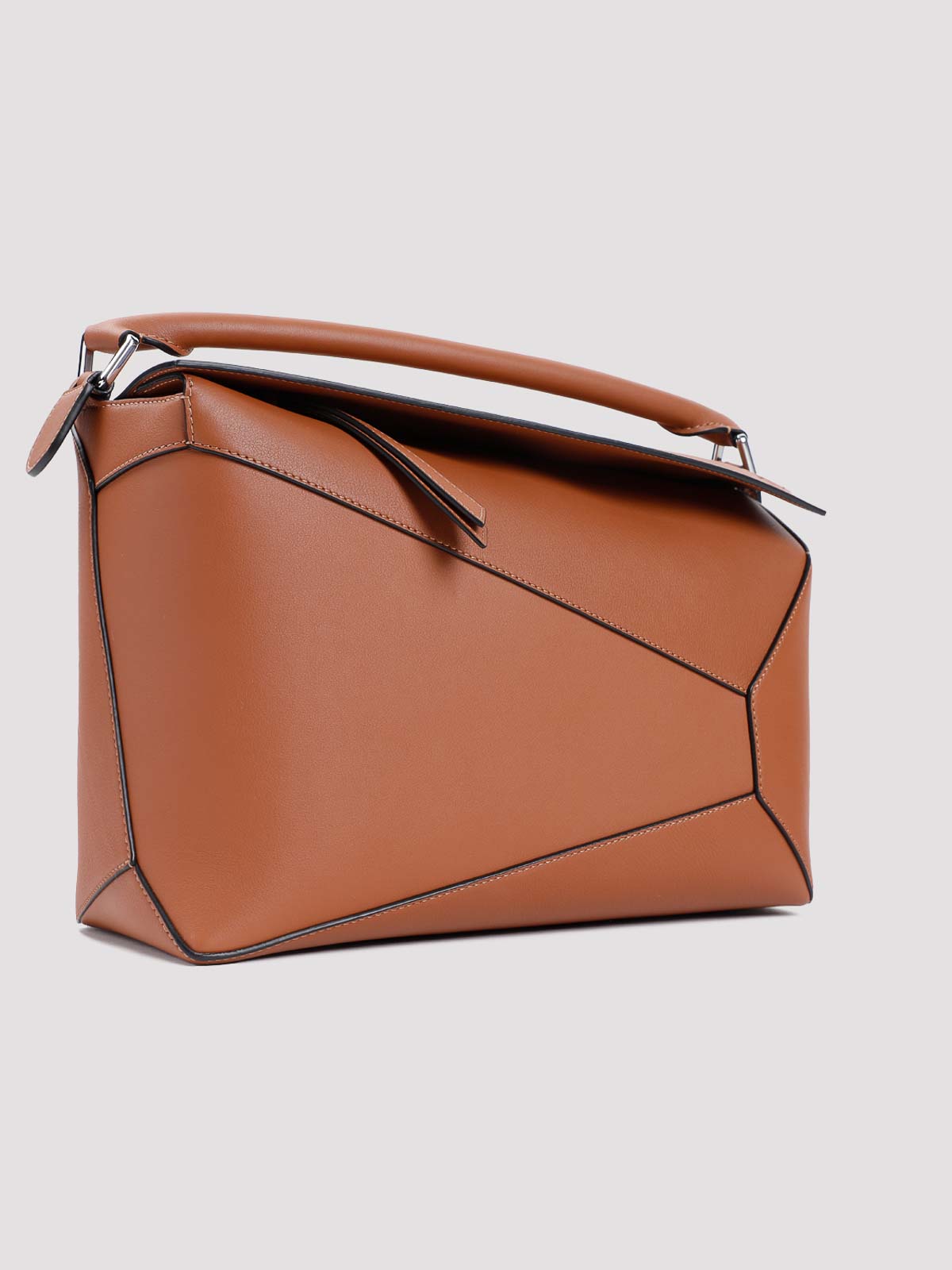 Nouveau grand sac à bandoulière en cuir de veau marron Loewe Puzzle Edge. Construction en cuir de veau marron, panneaux géométriques et asymétriques, poignée sur le dessus, fermeture à glissière dissimulée, bandoulière amovible et réglable, poches intérieures plaquées, doublure.