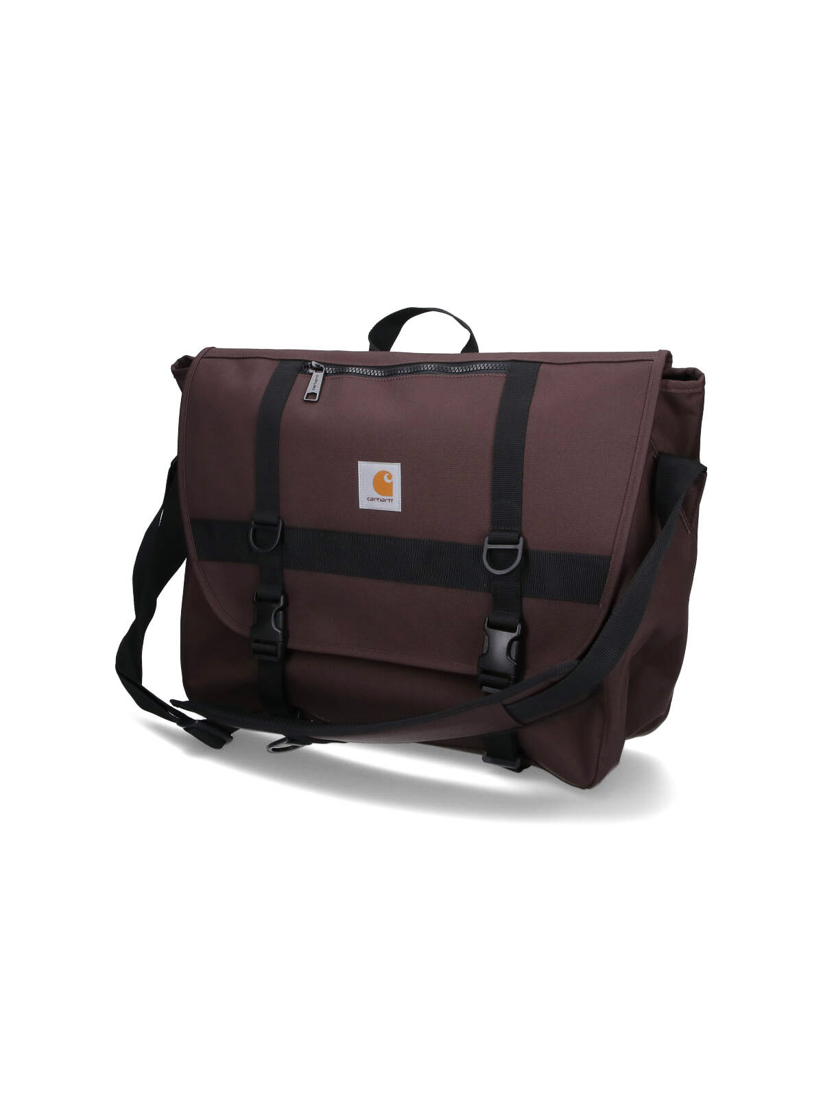 Sac à bandoulière Carhartt Wip Jake Messenger, en tissu marron, poignée supérieure, bandoulière réglable, fermeture à boucle sur le devant, écusson logo multicolore sur le devant, détails en tissu contrastant, une poche avant zippée, une poche intérieure zippée, un compartiment intérieur principal.