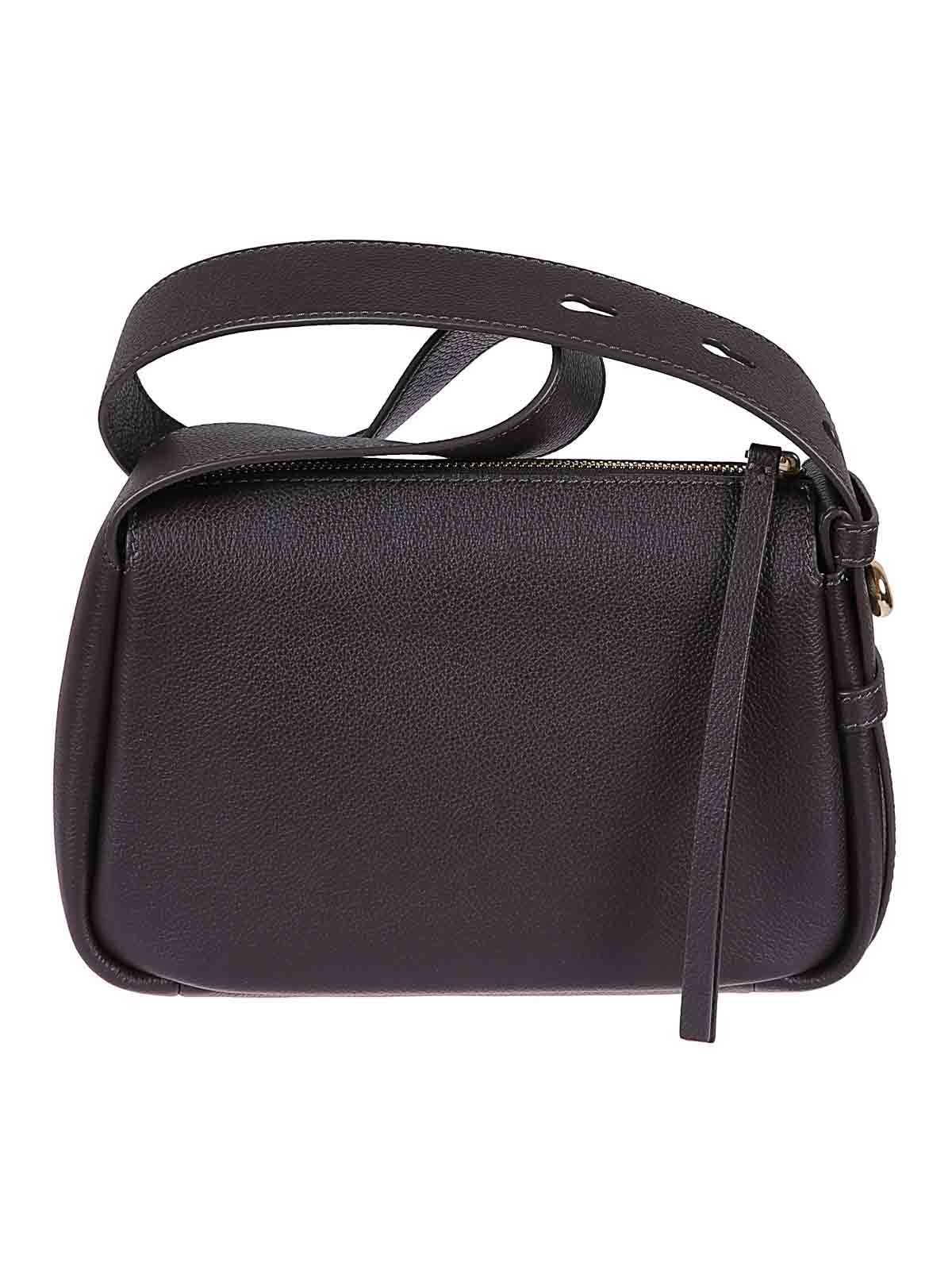 Sac en cuir grainé marron foncé, fermeture zippée, bandoulière réglable, une poche intérieure.