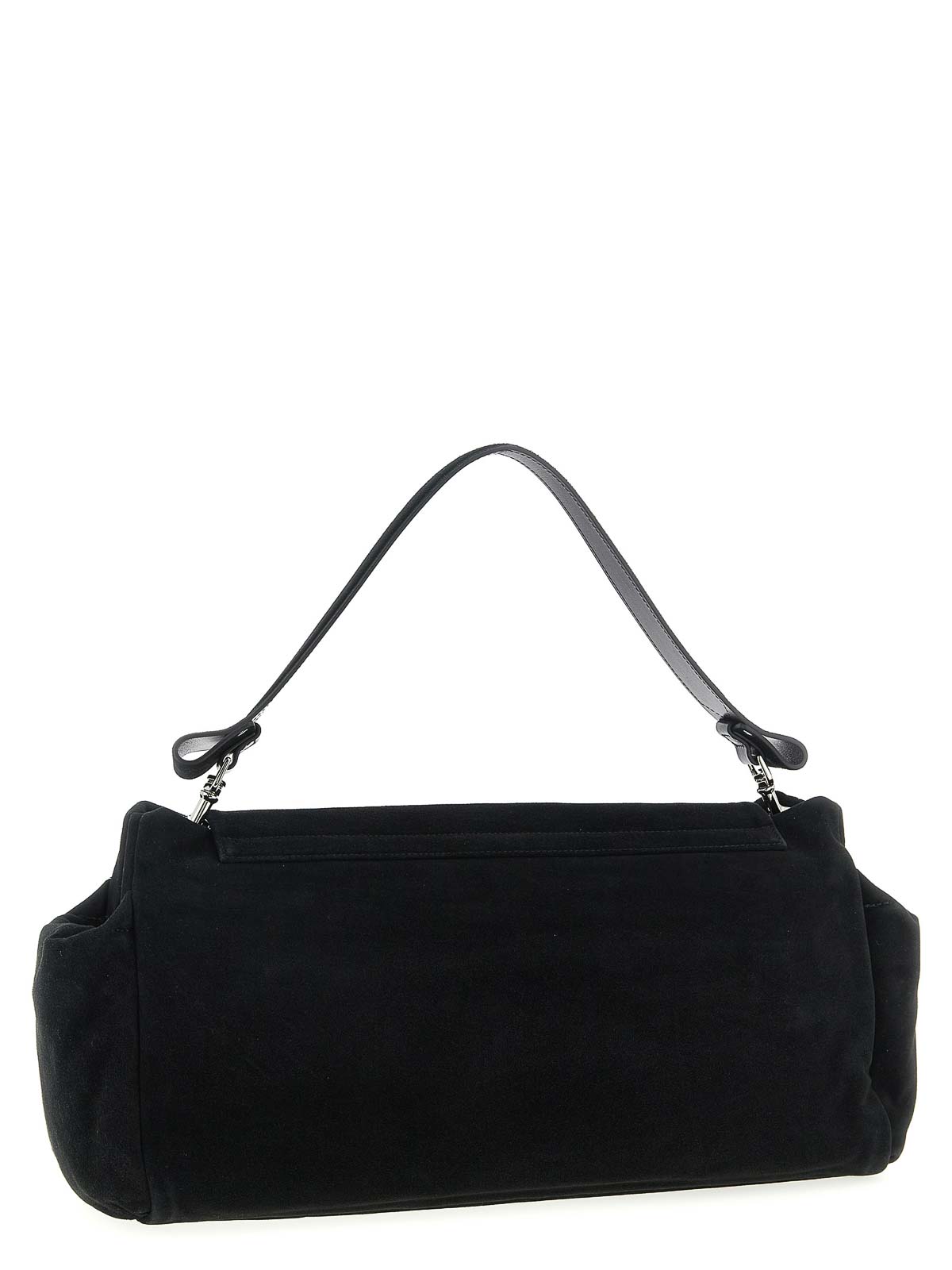 sac à bandoulière en daim Hazel XL, fermeture à rabat magnétique avec logo orbe métallique sur le devant, poignée amovible, soufflets avec poches latérales.