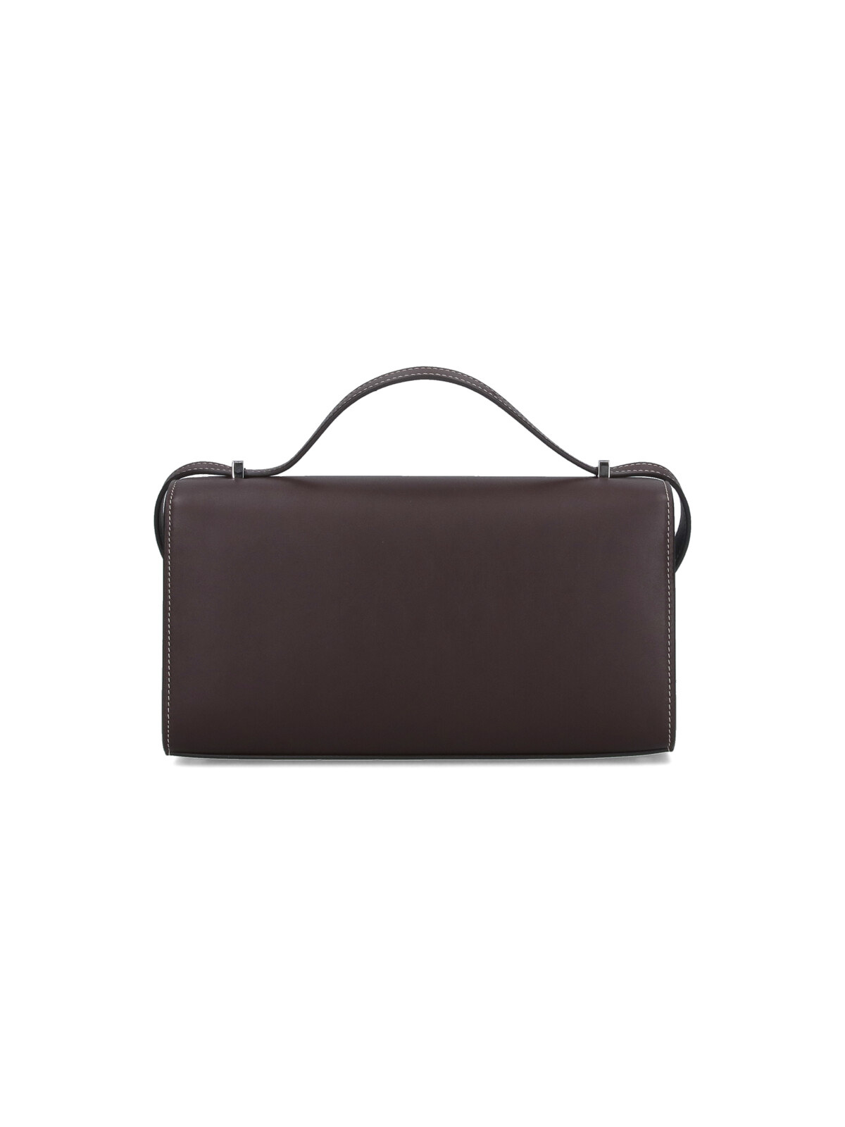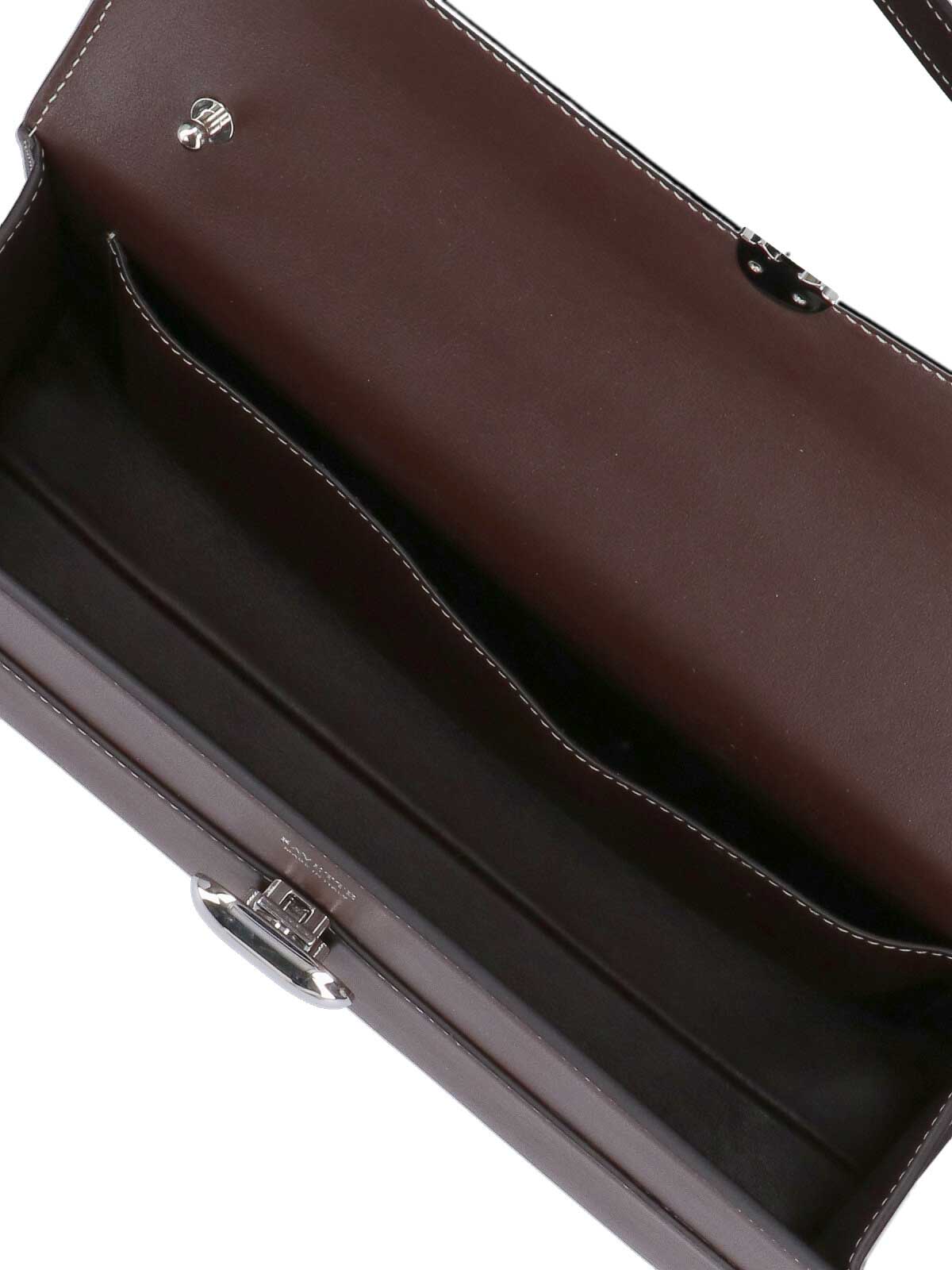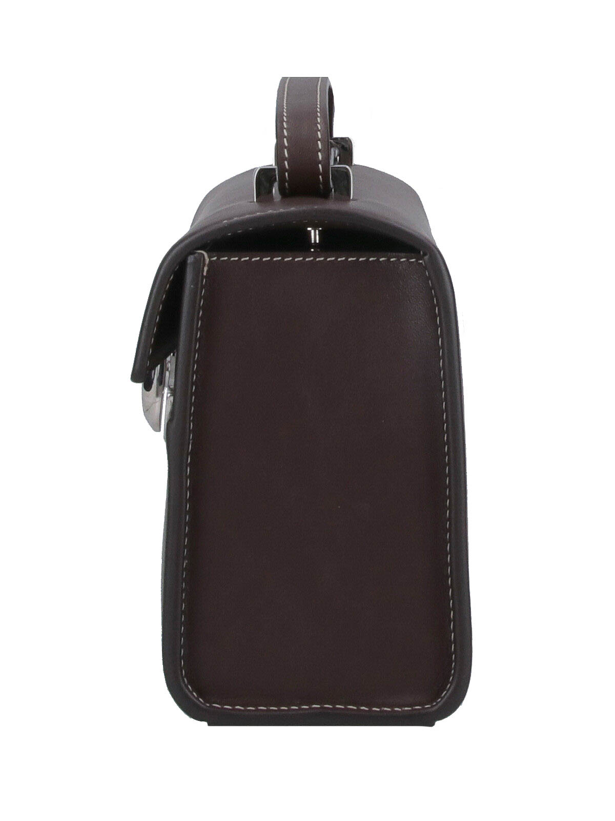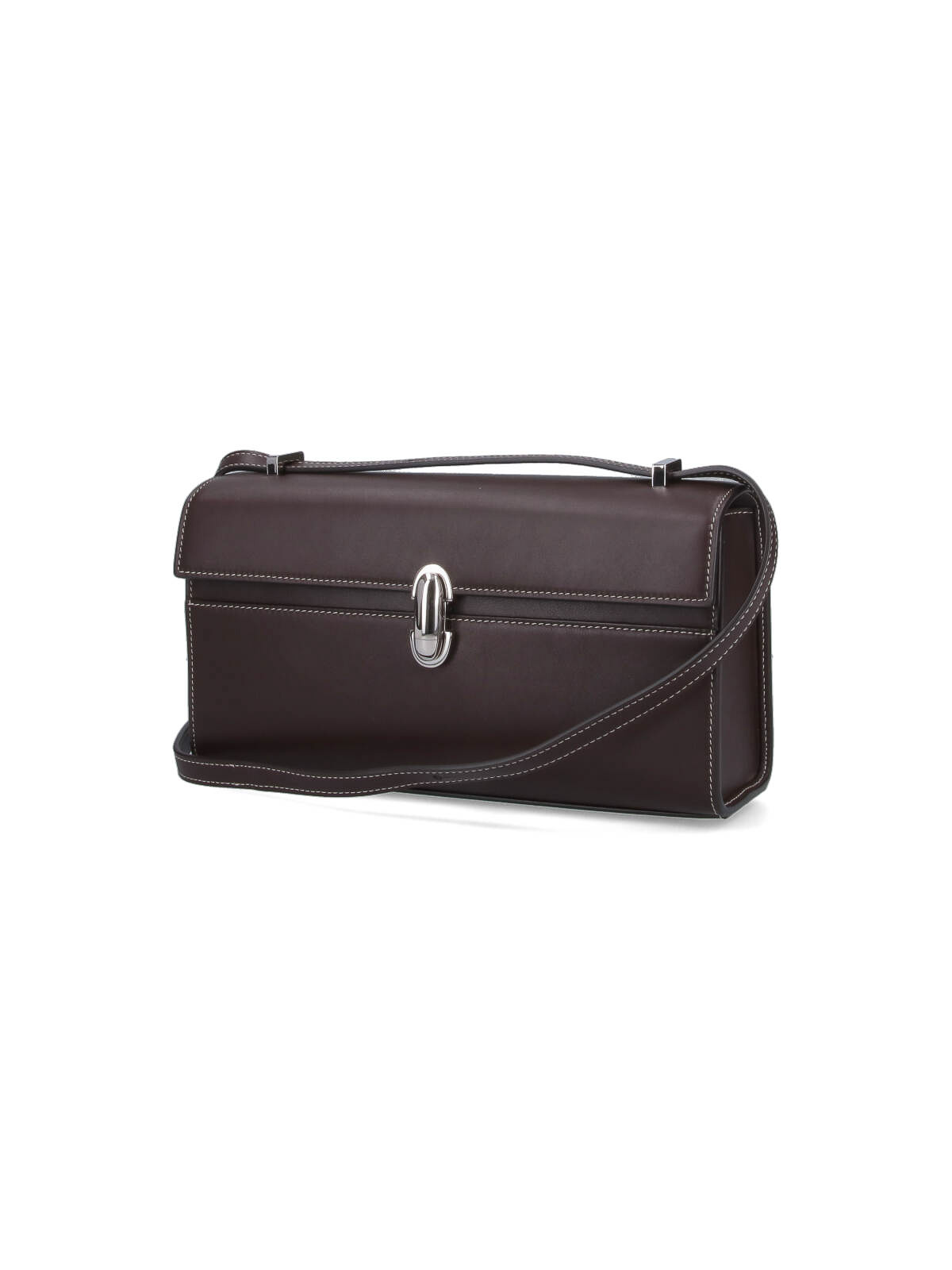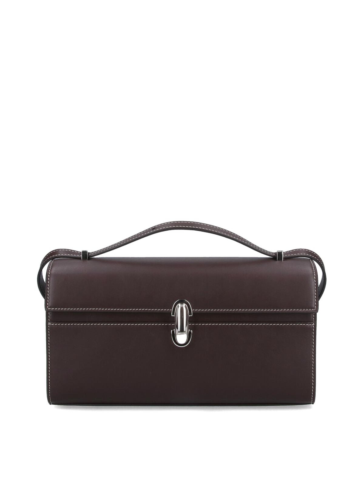 sac à bandoulière Symmetry 26 Savette, en cuir marron, bandoulière coulissante, fermeture à rabat torsadé, logo doré imprimé, une poche intérieure plate, un compartiment intérieur principal.