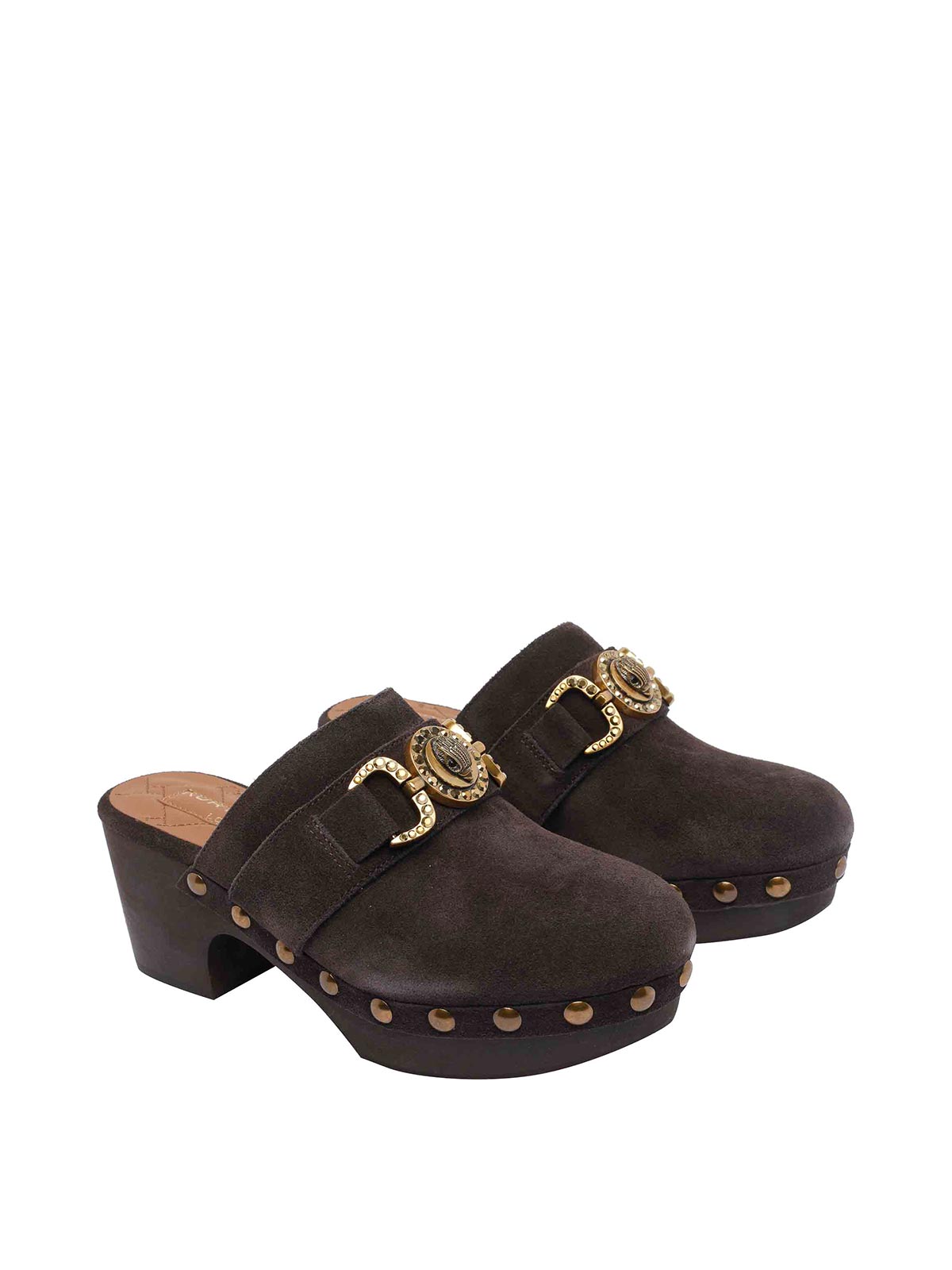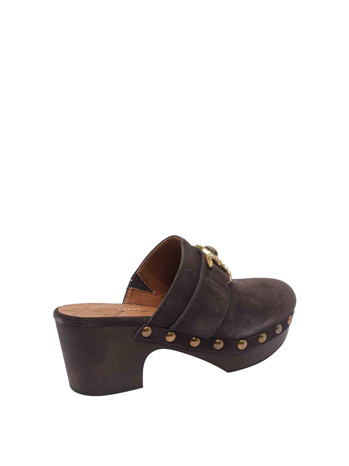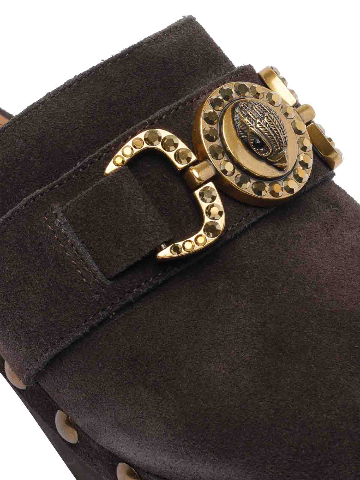 Sabots de manoir décontractés Kurt Geiger, marron foncé, bout rond, logo frontal. Nom de la