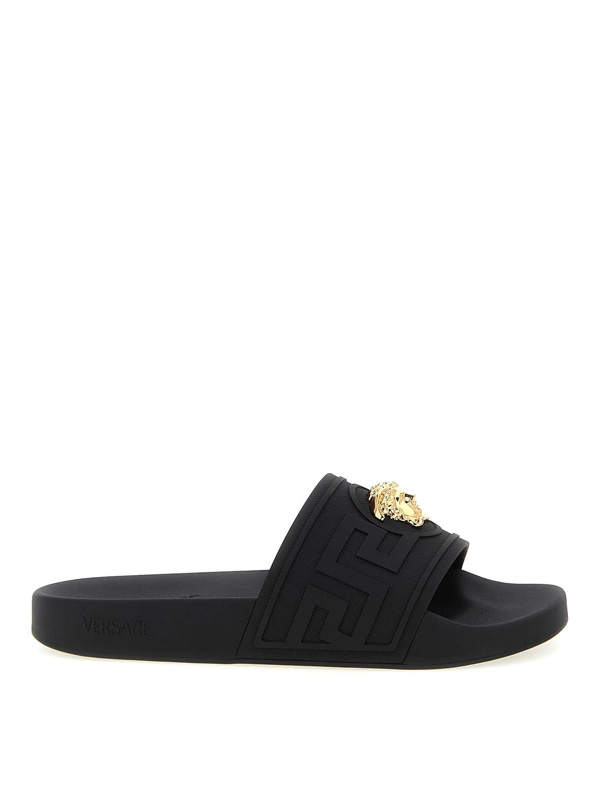 Sandales en caoutchouc avec détail tridimensionnel « La Medusa » en métal et motif grec sur la partie supérieure.