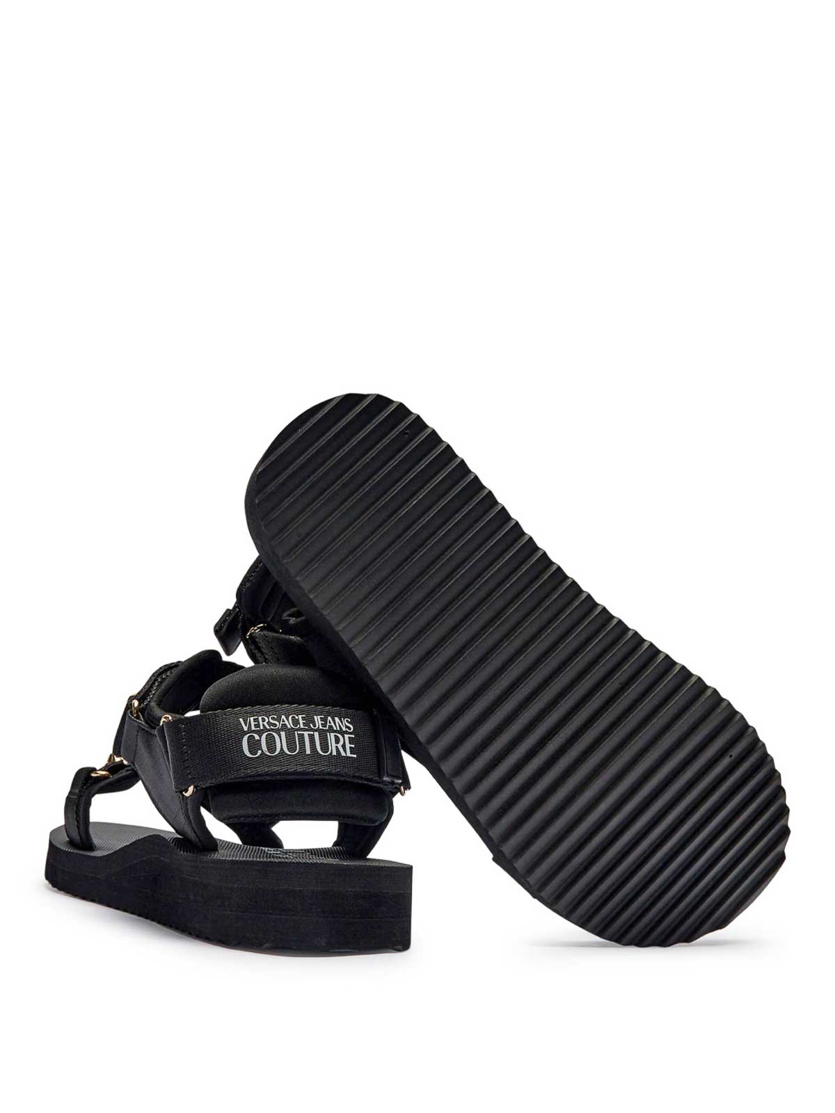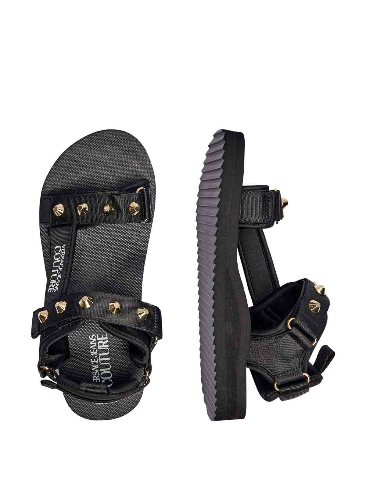 Sandale à clous iPanema en noir, sandale ouverte Versace à lanières, ornée de clous et de l'impression du logo à la sandale, la sandale est présentée avec une sandale ouverte en caoutchouc et une sandale ouverte plate en caoutchouc, sandales ouvertes pour femme à bretelles ouvertes en impression, logo imprimé avec velcro plat, couleur noire