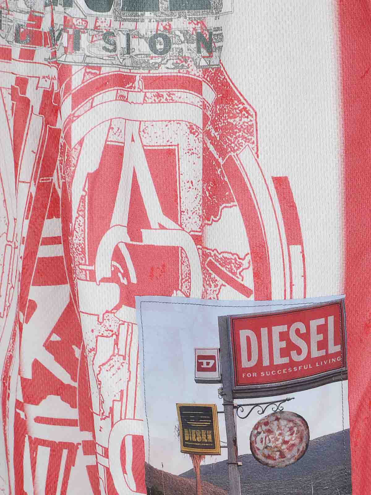 Short en tissu technique Diesel, taille élastique et longueur aux genoux. Inspirés de l'uniforme de football classique, ils sont décorés d'un imprimé stylisé à 78 exemplaires et de patchs photographiques hyperréalistes représentant différentes versions du logo Diesel.