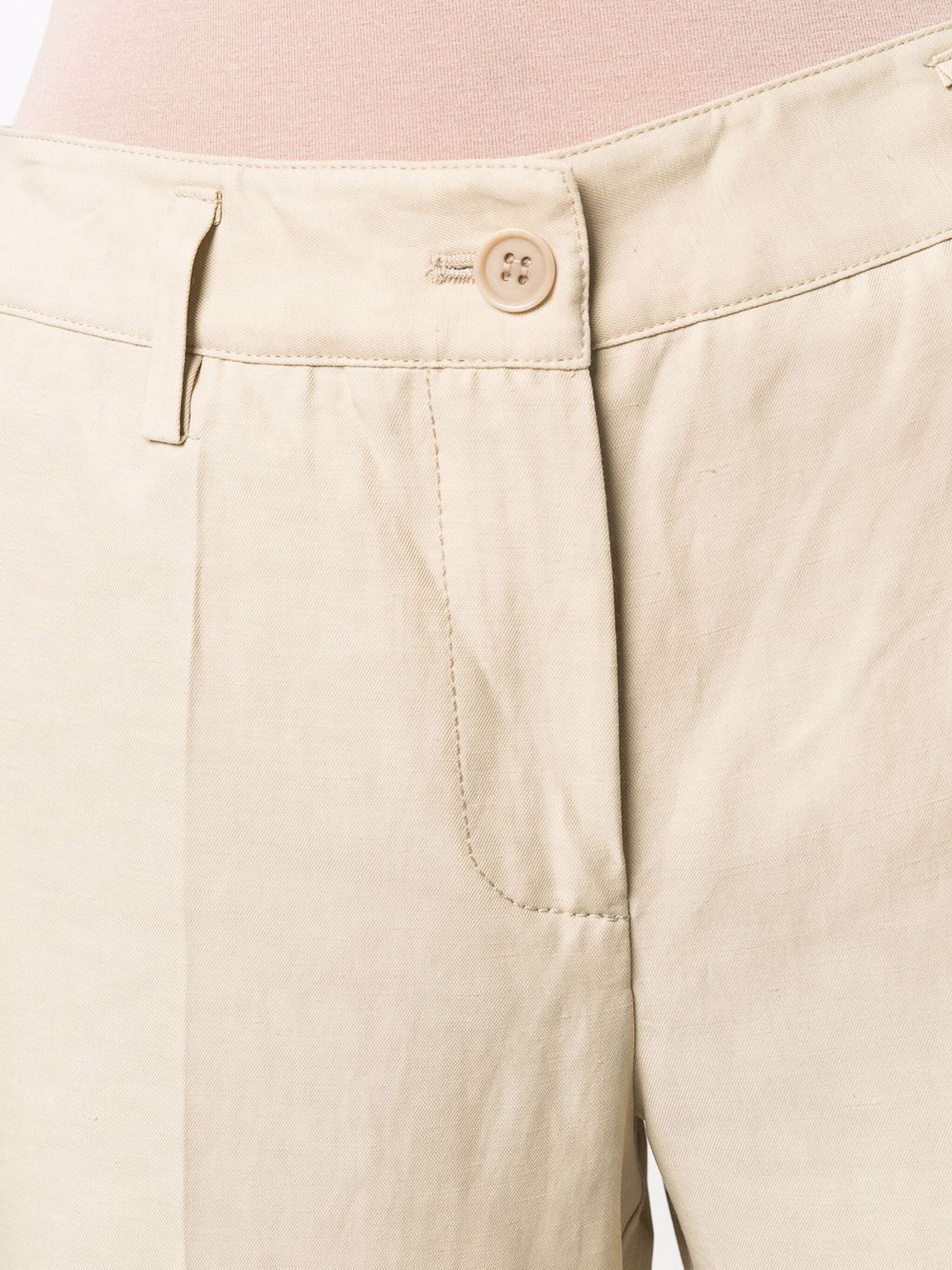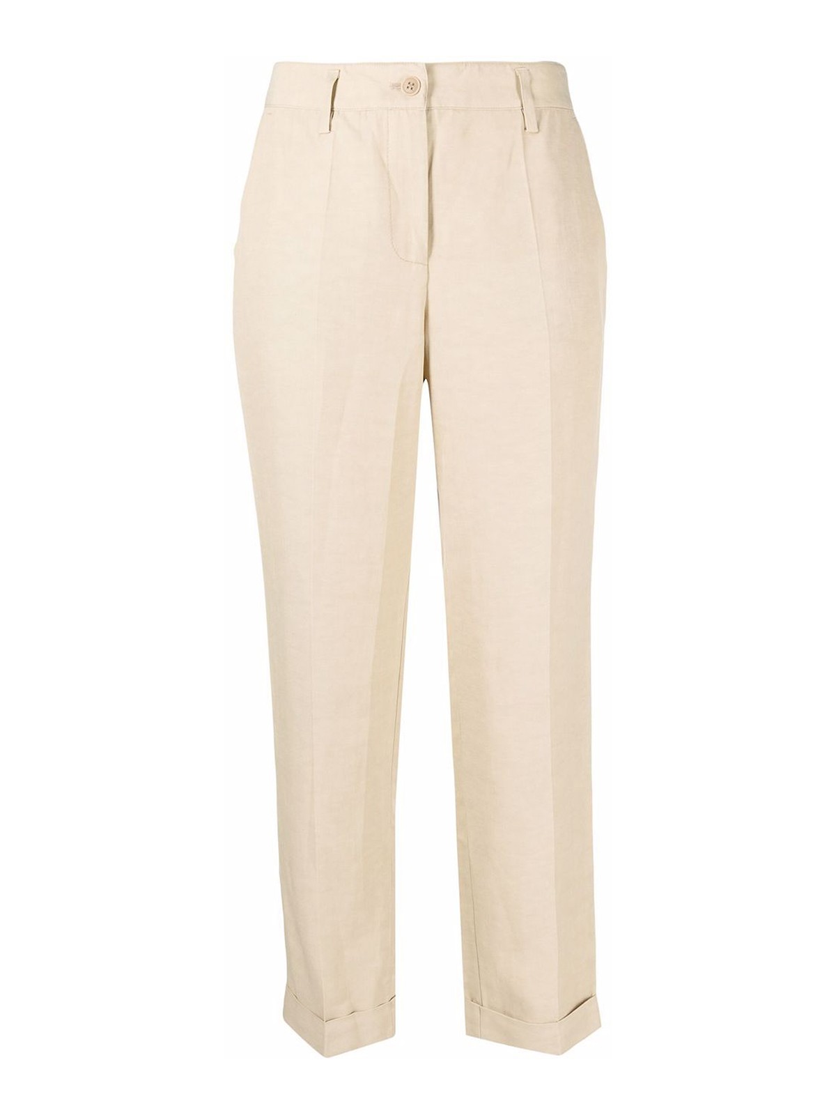 Pantalon fuselé beige en lin/lin avec ourlet retroussé avec passants de ceinture, bouton sur le devant et fermeture zippée, deux poches latérales encastrées, deux poches arrières passepoilées, jambe fuselée et ourlet retroussé