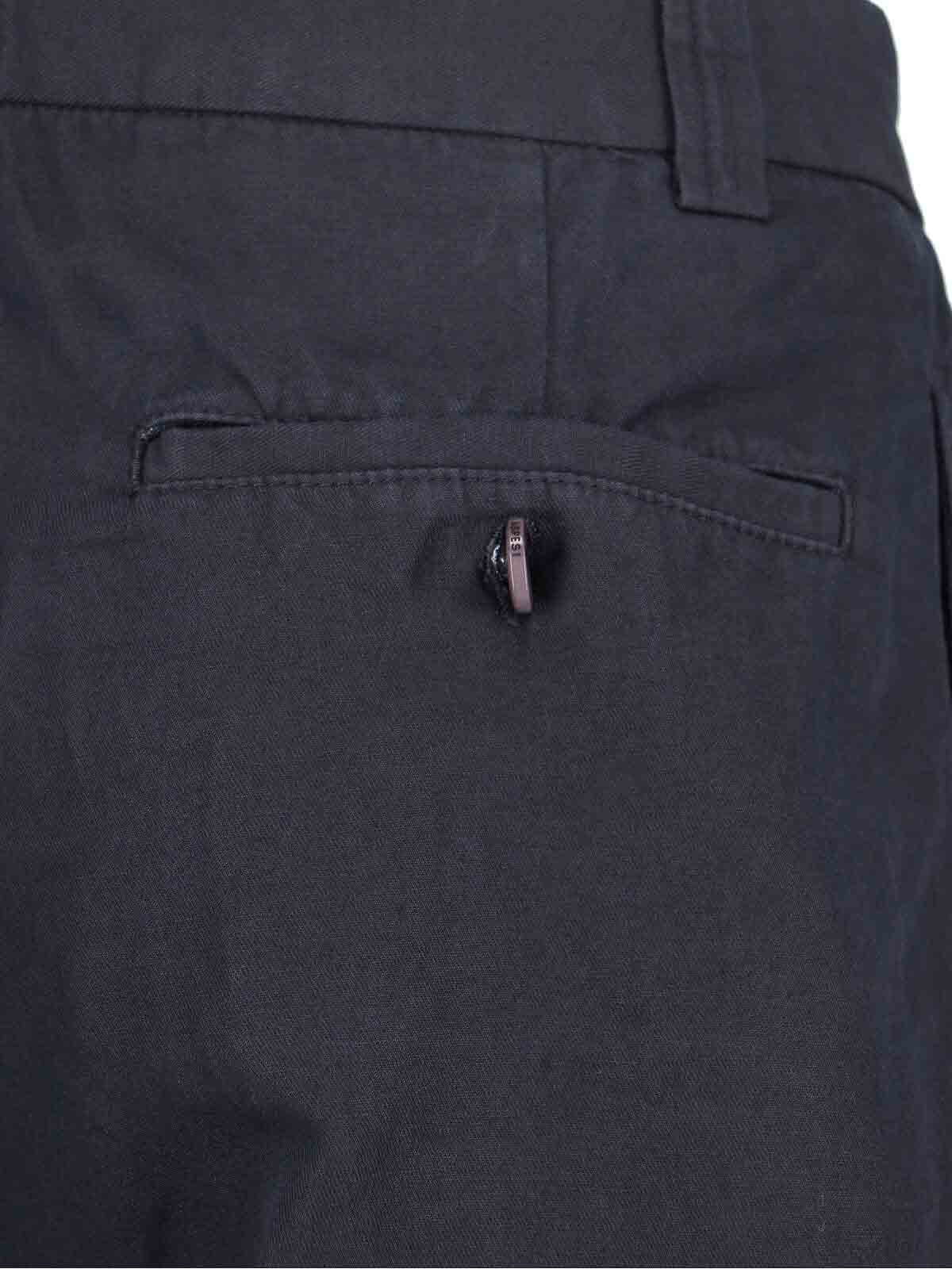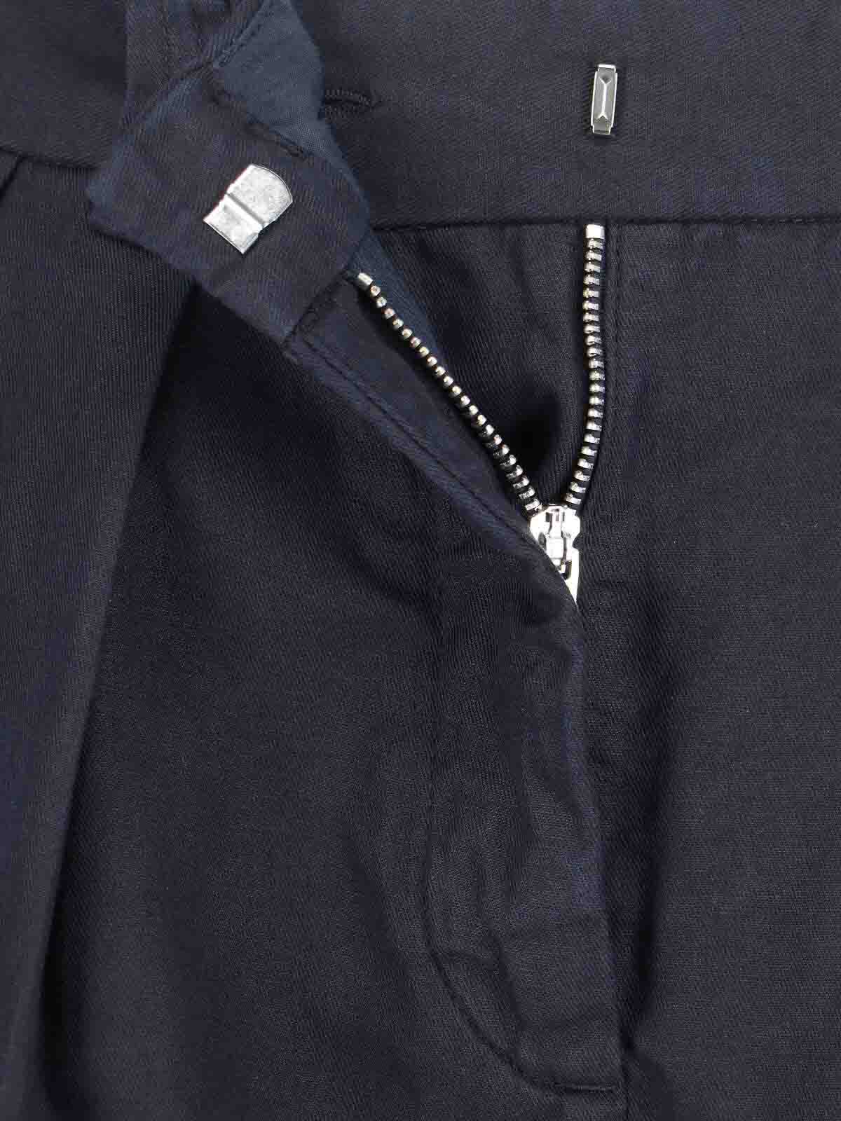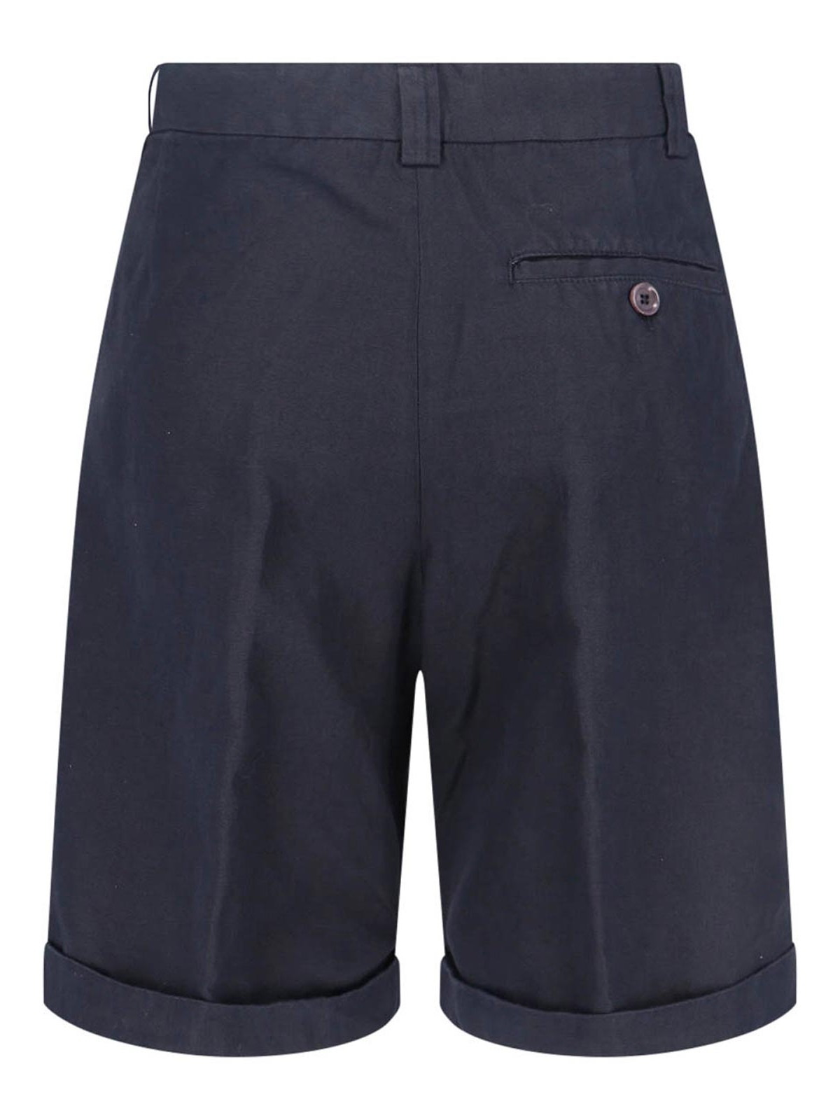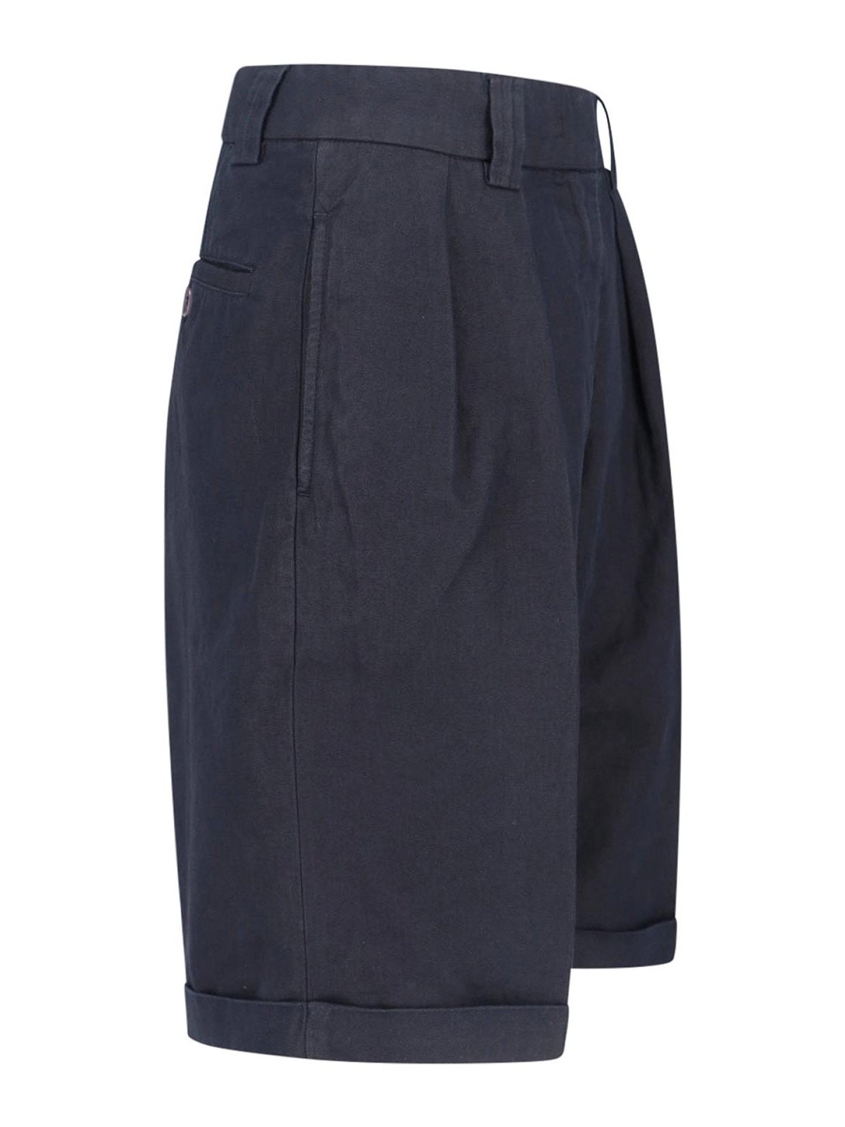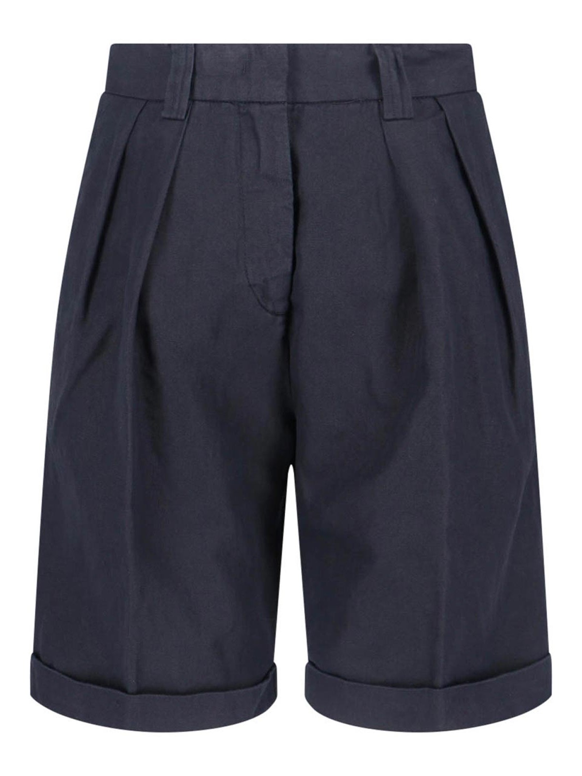 Short en coton et lin Aspesi, bleu, teinte bleu marine, taille moyenne, fermeture zippée et crochet, passants de ceinture, pinces sur le devant, deux poches latérales, deux poches arrière boutonnées, jambe droite.