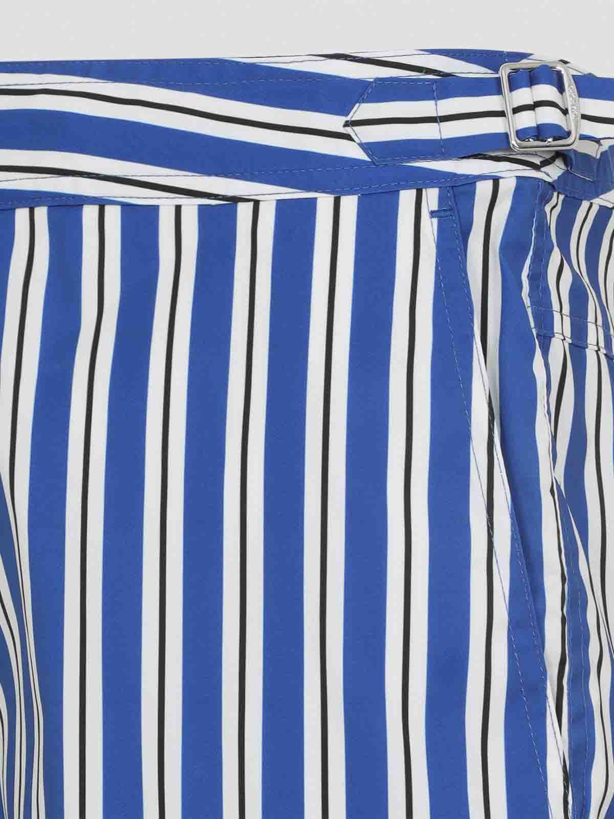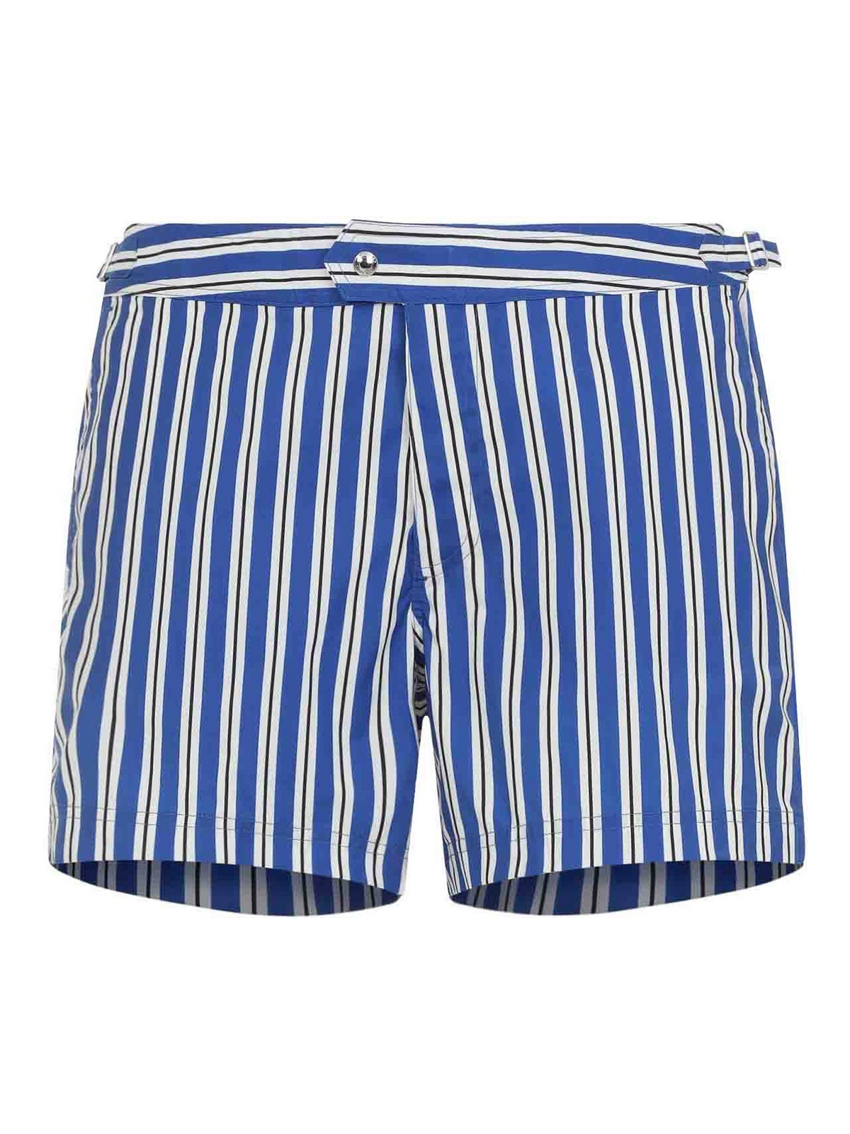 Short de bain à rayures régimentaires bleu et blanc Tom Ford Combo. Tissu en pur polyester, fermeture zippée dissimulante sur le devant, fermeture boutonnée sur le devant, bretelles latérales réglables avec boucle métallique argentée, ourlet droit. Motif à rayures bleues et blanches sur l'ensemble.