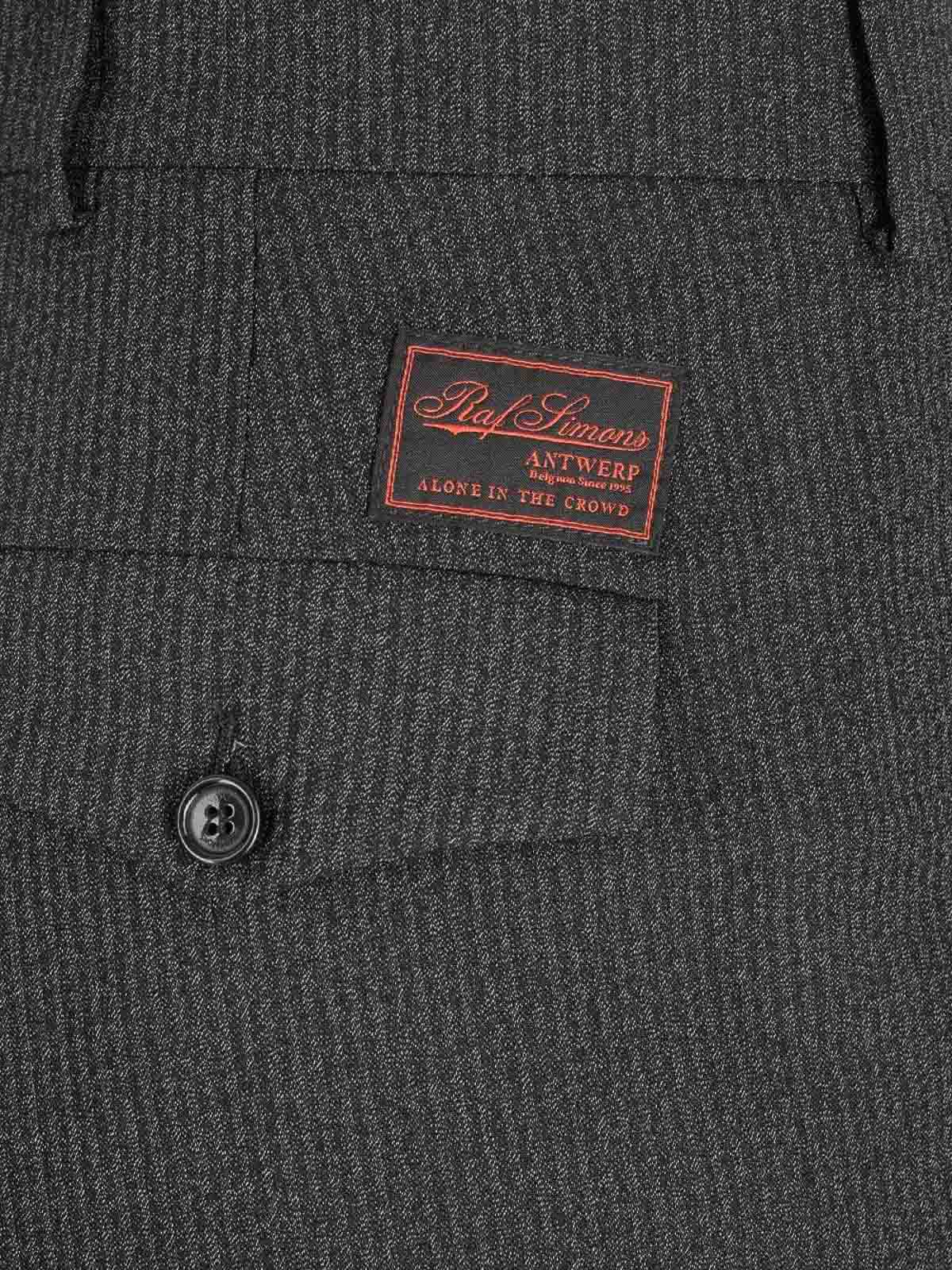 Pantalon droit gris de la marque Raf Simons en tissu rayé de laine mélangée, deux poches latérales, deux poches à rabat au dos, passants de ceinture.