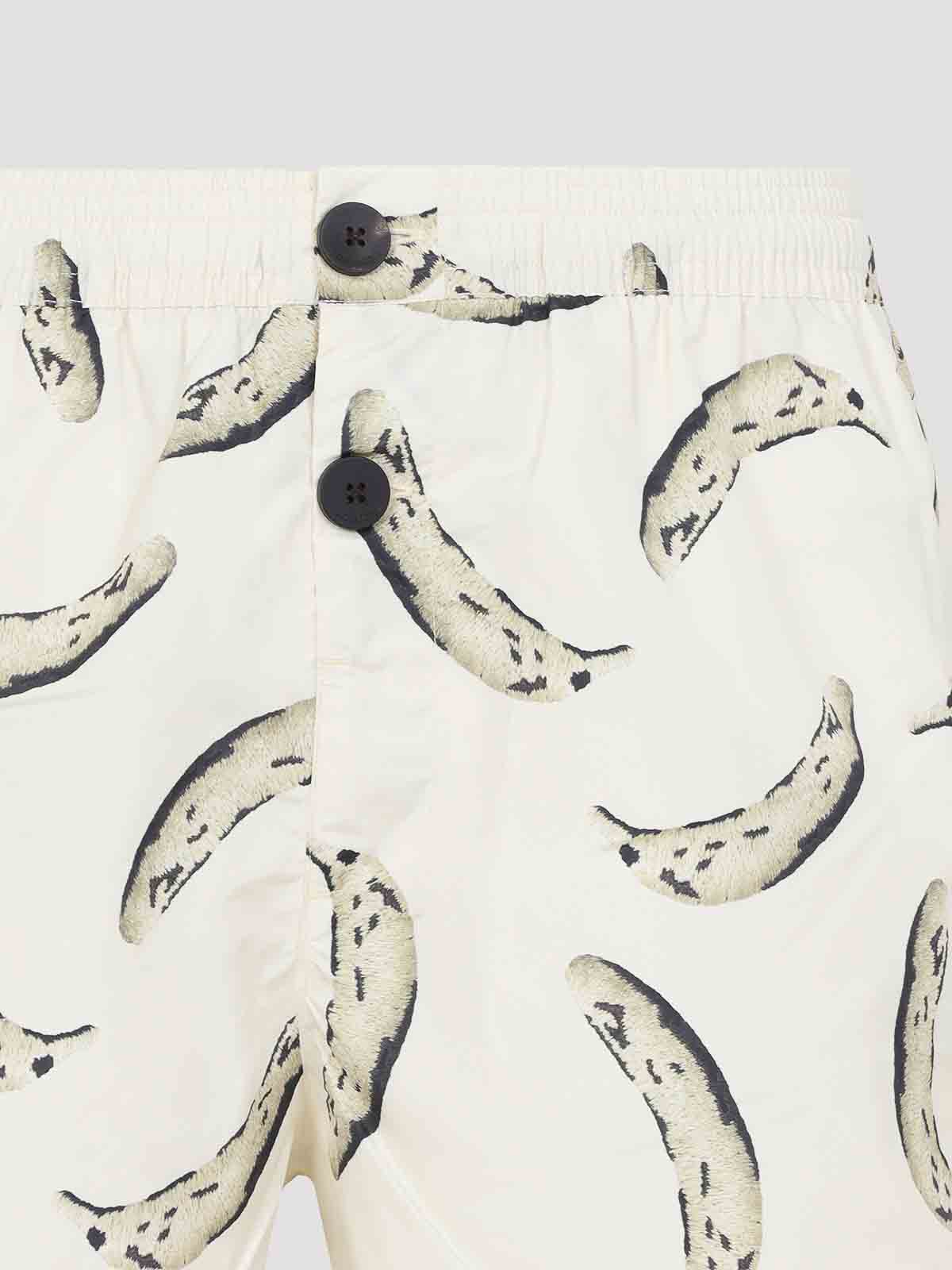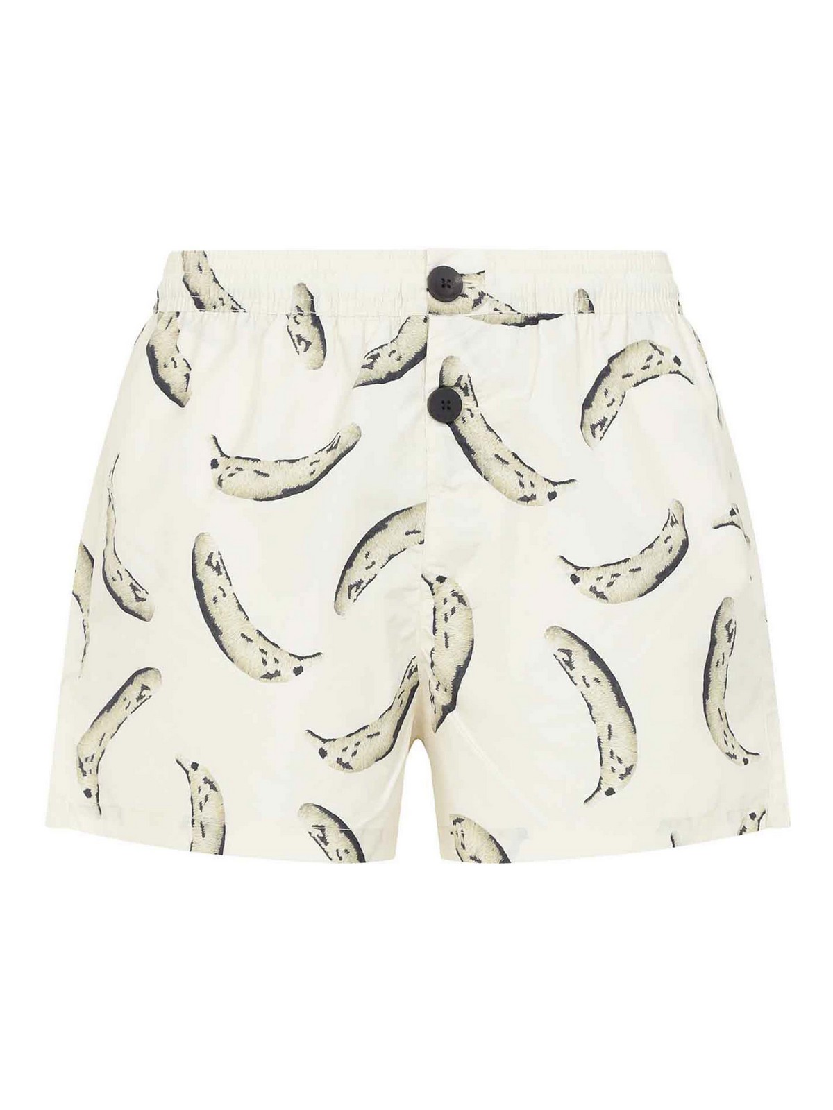 Short puntini jaune à imprimé banane Jacquemus. Confectionné en tissu polyester, taille élastique, détails boutonnés noirs contrastants sur le devant, poche arrière avec logo appliqué, ourlet droit. Fond beige avec motif banane imprimé sur l'ensemble.