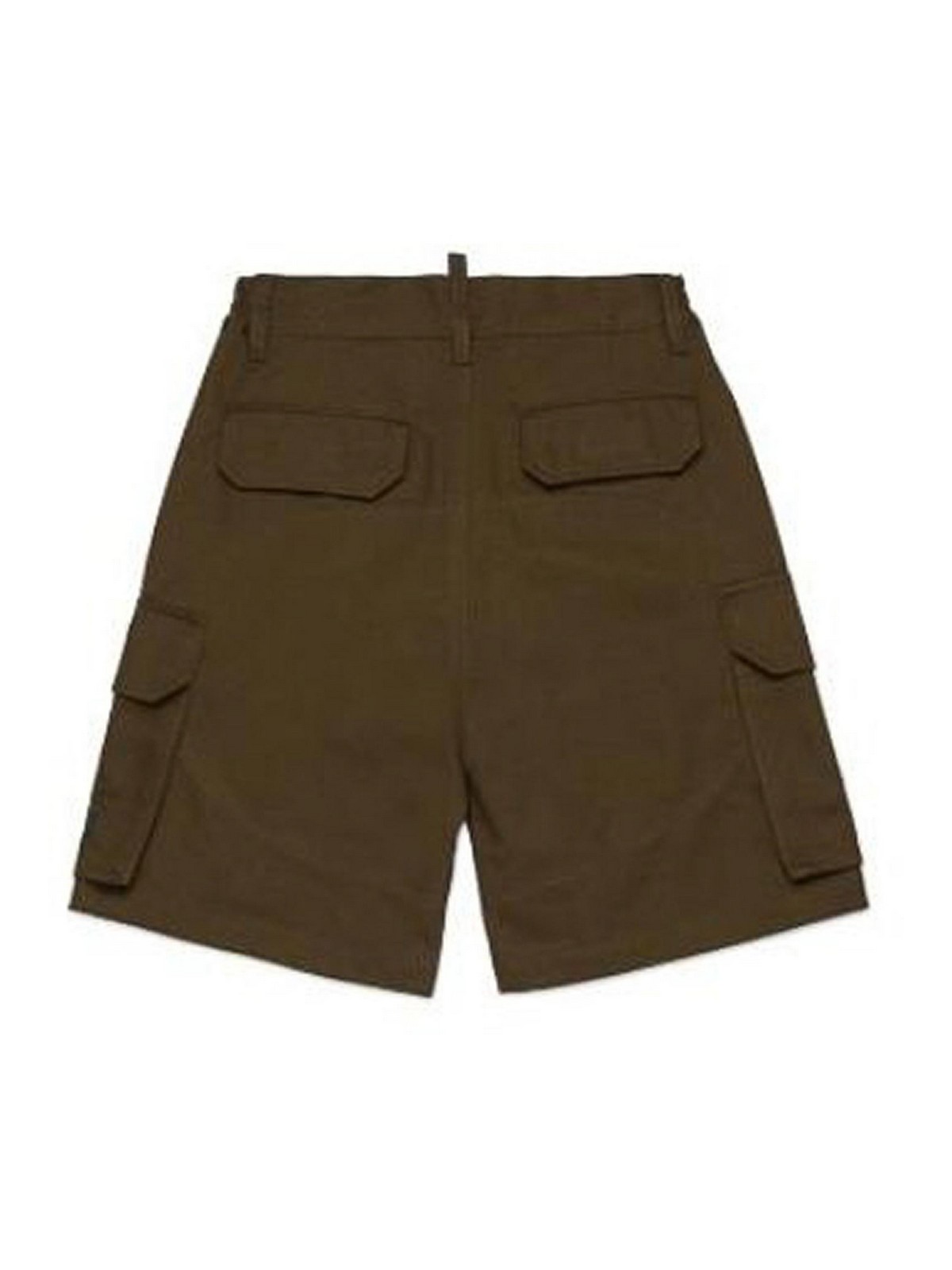 Bermuda avec logo marron, taille élastiquée, fermeture boutonnée, poches latérales à rabat, poches arrière à rabat, détail du logo