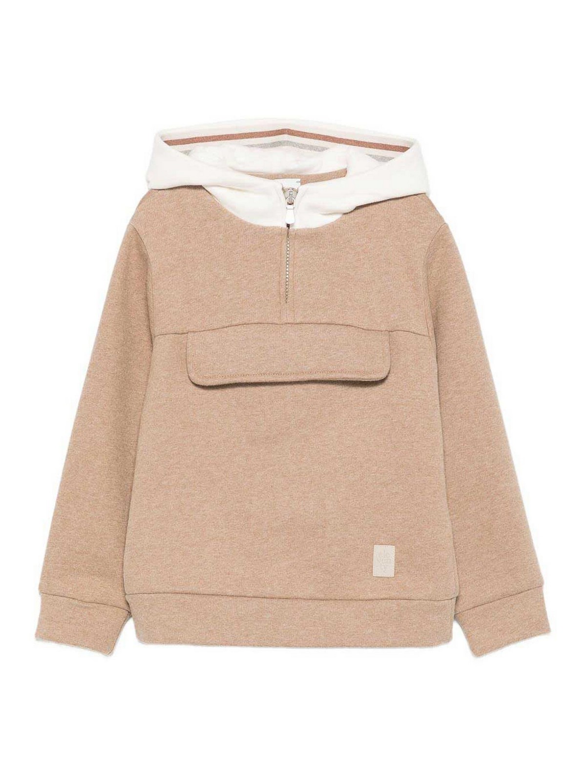 Sweat-shirt à demi-fermeture éclair beige avec poche avant à demi-fermeture éclair, capuche, manches longues avec application