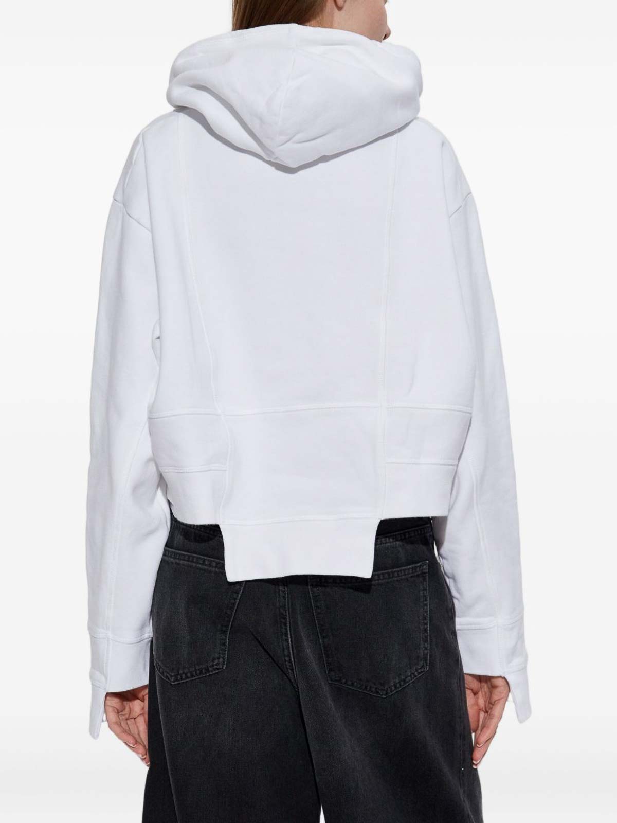 Capuche blanche avec cordon de serrage, logo imprimé, manches longues, design à panneaux, ourlet asymétrique