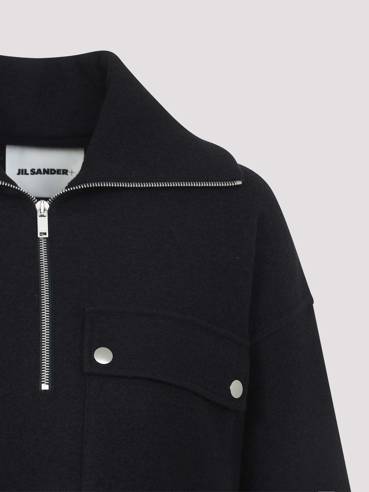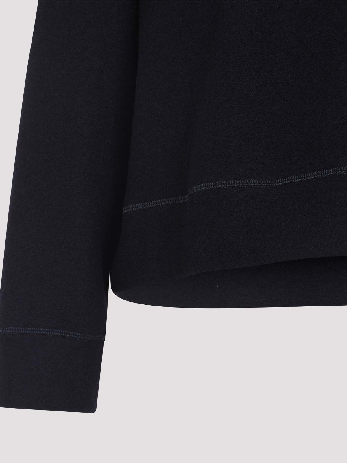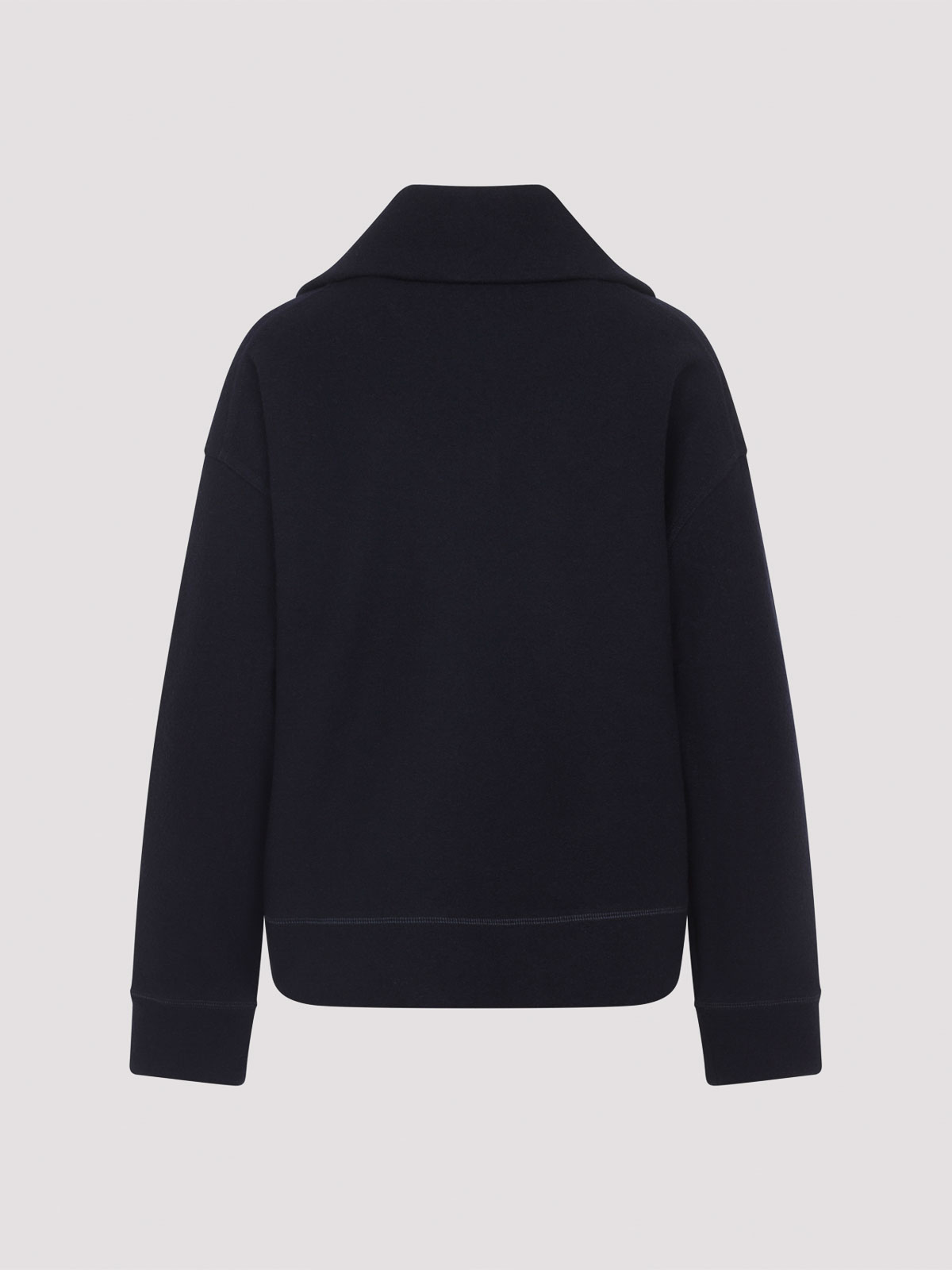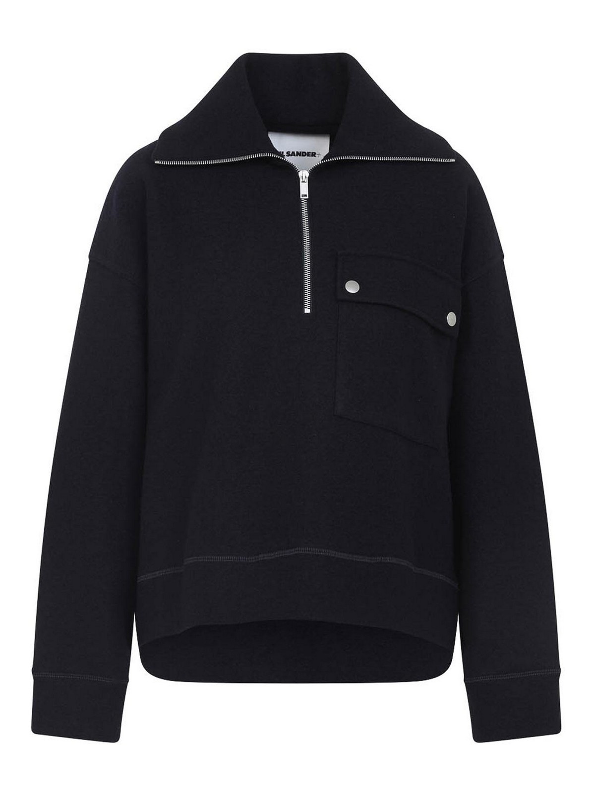 Jil Sander + sweat-shirt à manches longues en laine bleu nuit confectionné et mélangé, col pointu, demi-pointe, rabat zippé, poche boutonnée, épaules tombantes, manches longues, ourlet asymétrique