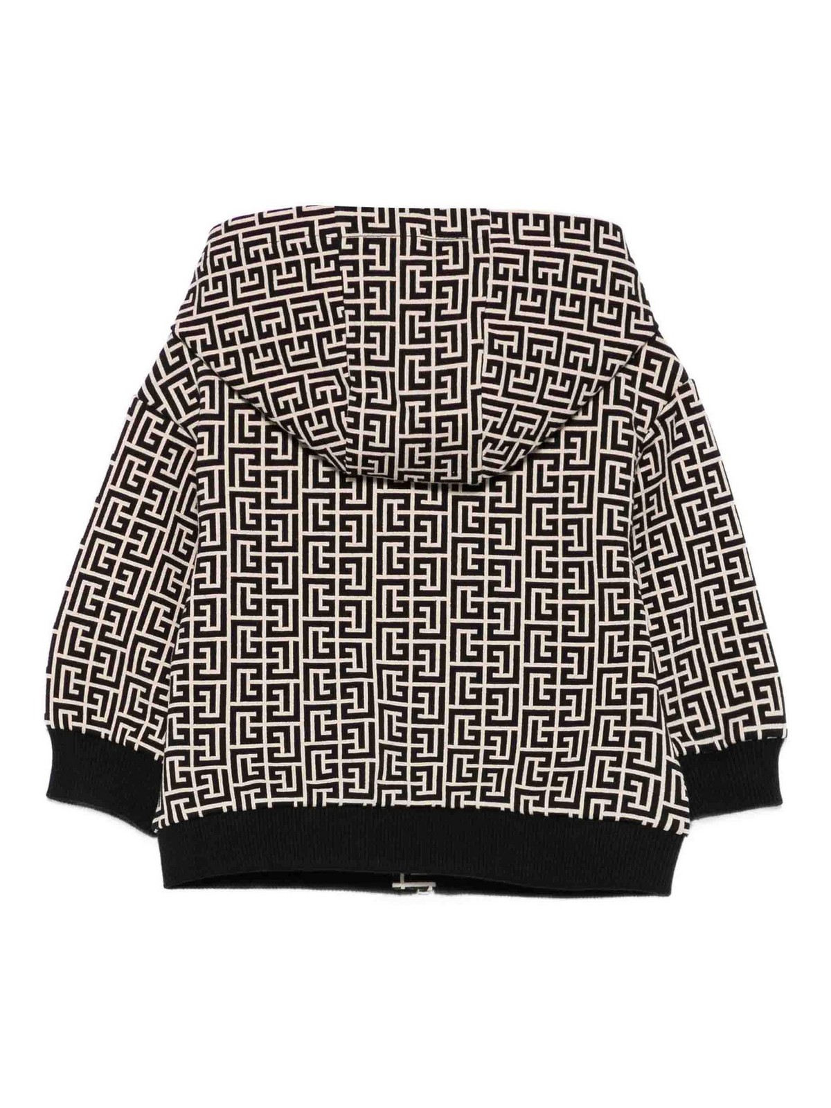 Motif monogramme beige/noir, fermeture éclair, col à capuche, manches longues, poignets côtelés