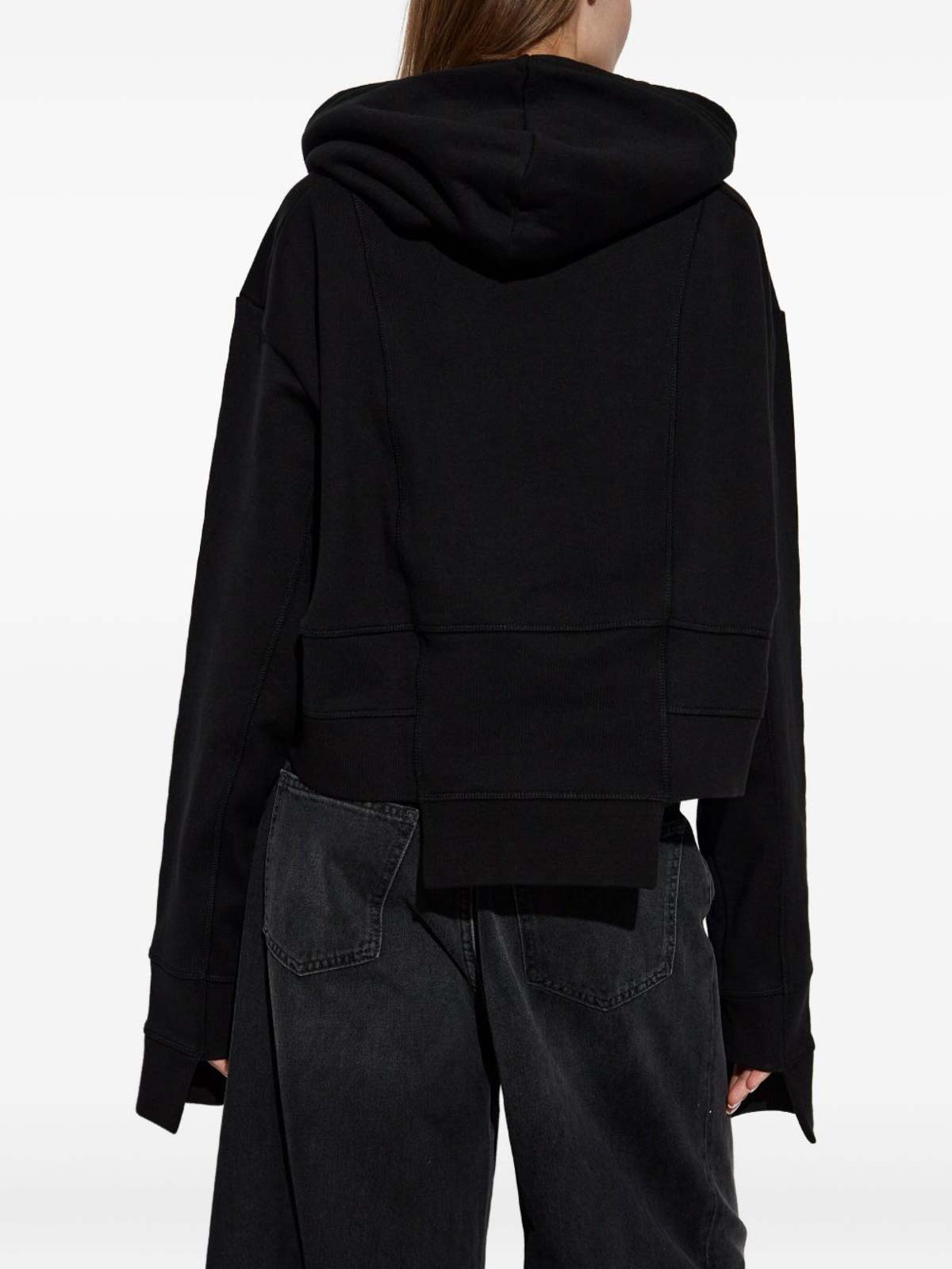 Capuche noire à empiècements avec cordon de serrage, logo imprimé, manches longues, ourlet asymétrique