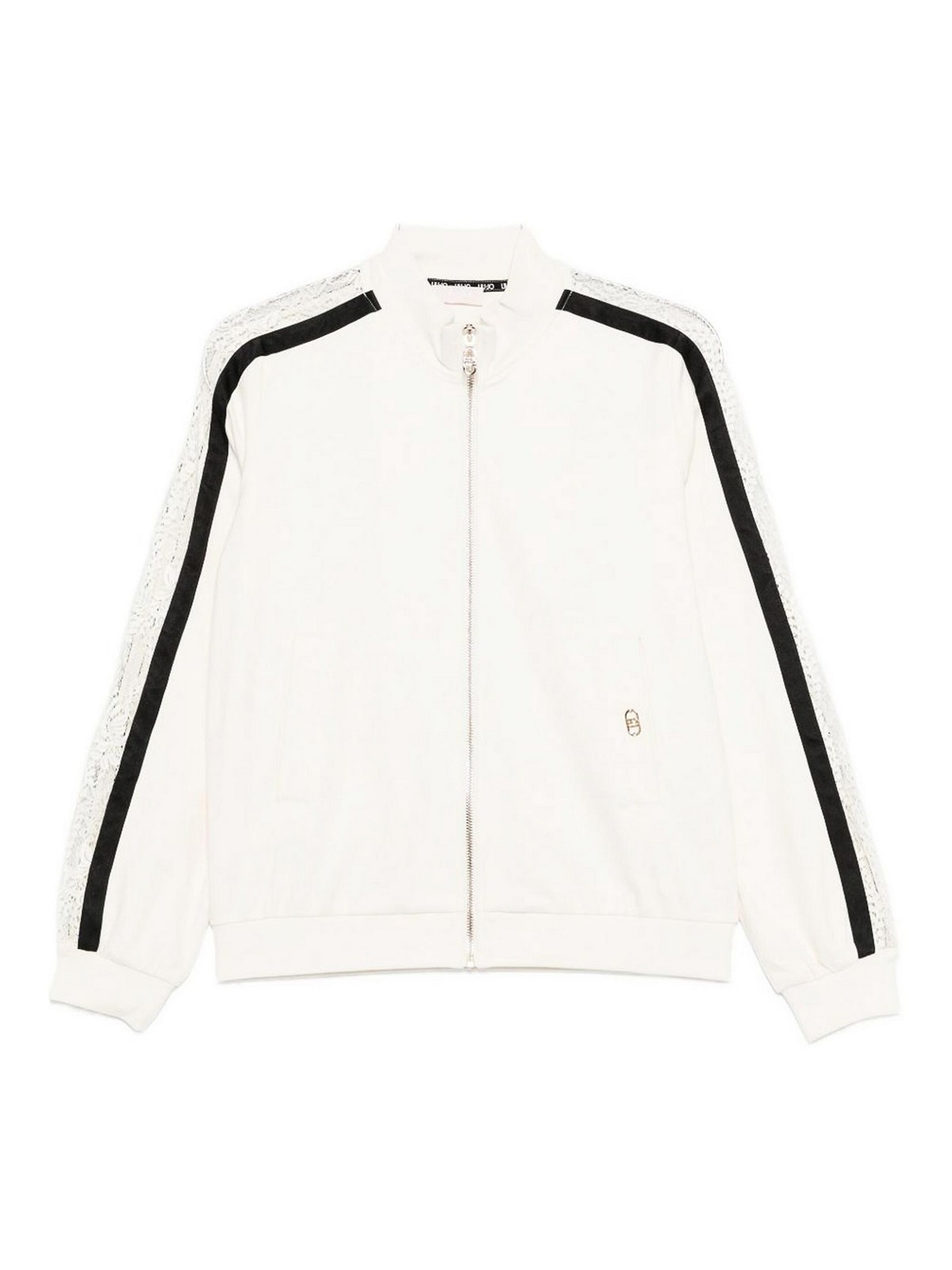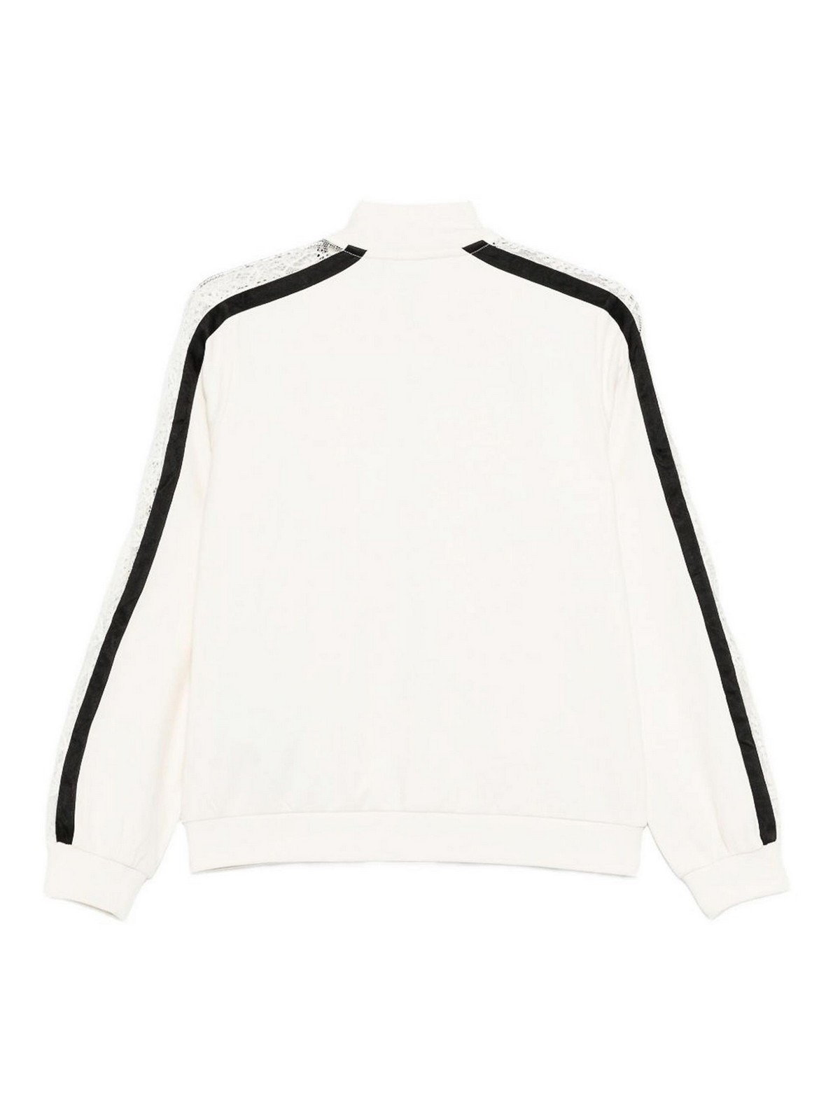Épaules en dentelle écrue, rayures latérales noires, fermeture éclair, manches longues, poignets côtelés
