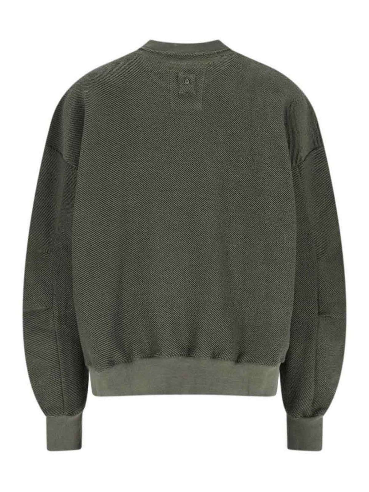Sweat-shirt à col rond blanc sable, en coton vert, épaules tombantes, manches longues, finitions côtelées, logo au dos, ourlet droit.