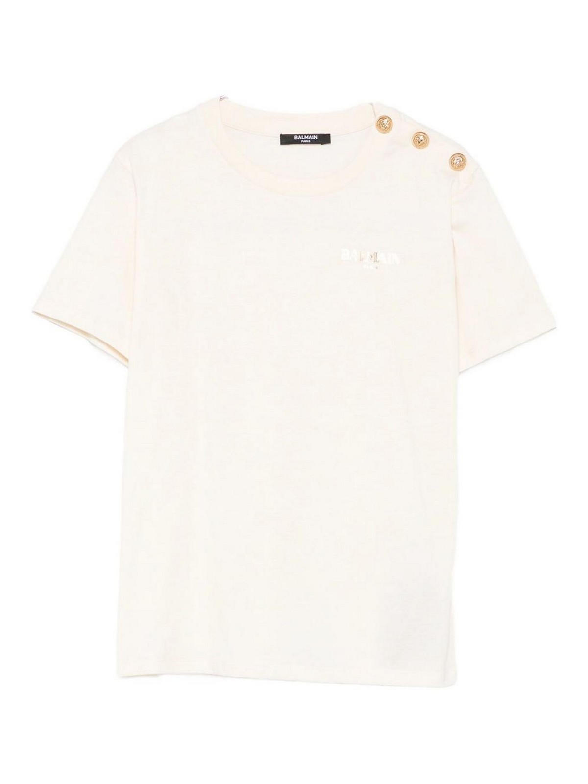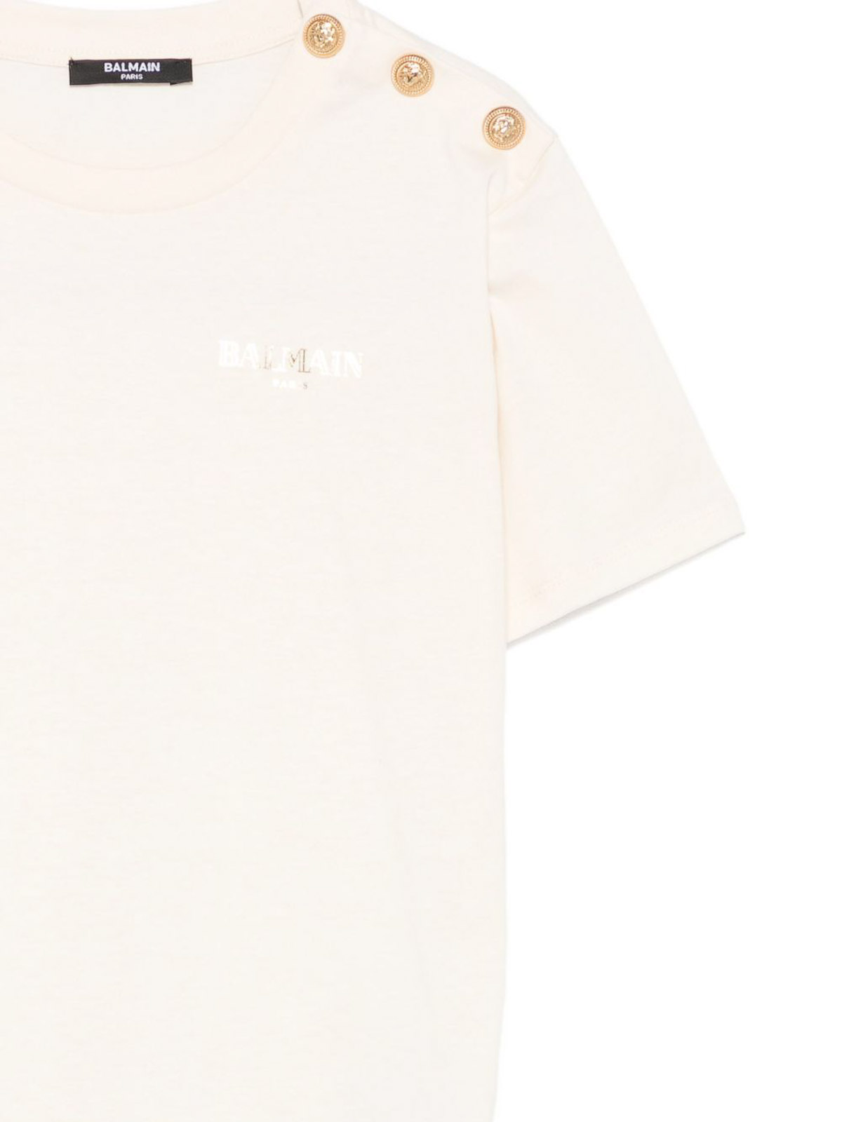 Le t-shirt pour fille Balmain pour enfants est un vêtement raffiné et confortable en coton beige à manches courtes et col rond, enrichi de boutons dorés et d'un détail de logo qui ajoutent une touche élégante et distinctive, parfait pour les looks casual chic pour les filles, Balmain kids, t-shirt avec décoration, beige, coton, manches courtes, col rond, boutons dorés, détail du logo