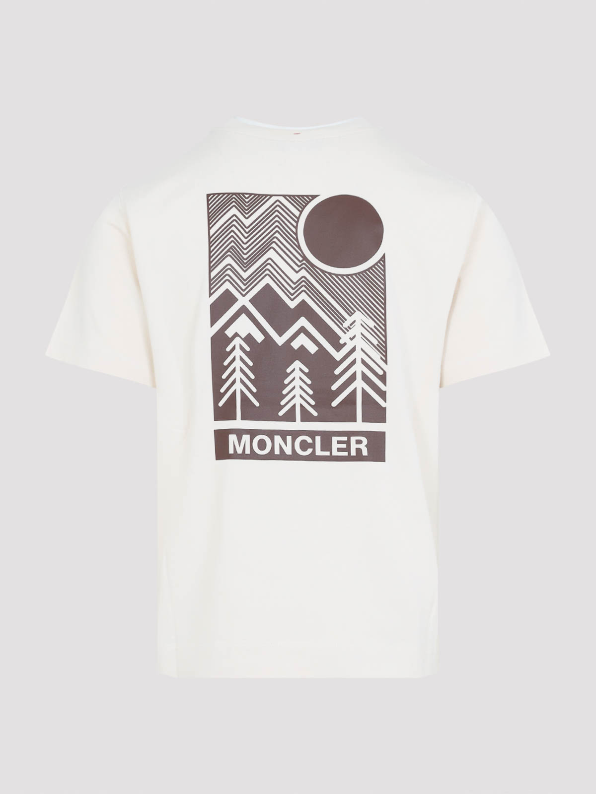 T-shirt à manches courtes blanc naturel Moncler Grenoble T-shirt blanc pur T-shirt blanc pur, col rond, poche plaquée sur la poitrine avec anneau, logo sur la poitrine, dos, design marron, manches courtes, ourlet droit