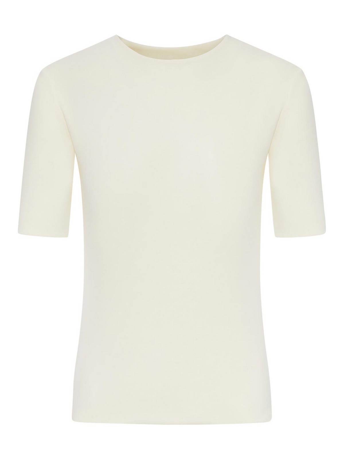 T-shirt en crêpe à manches courtes, coupe ajustée, col rond, crêpe fluide, le mannequin mesure 177 cm et porte une taille 34 de, couleur : craie