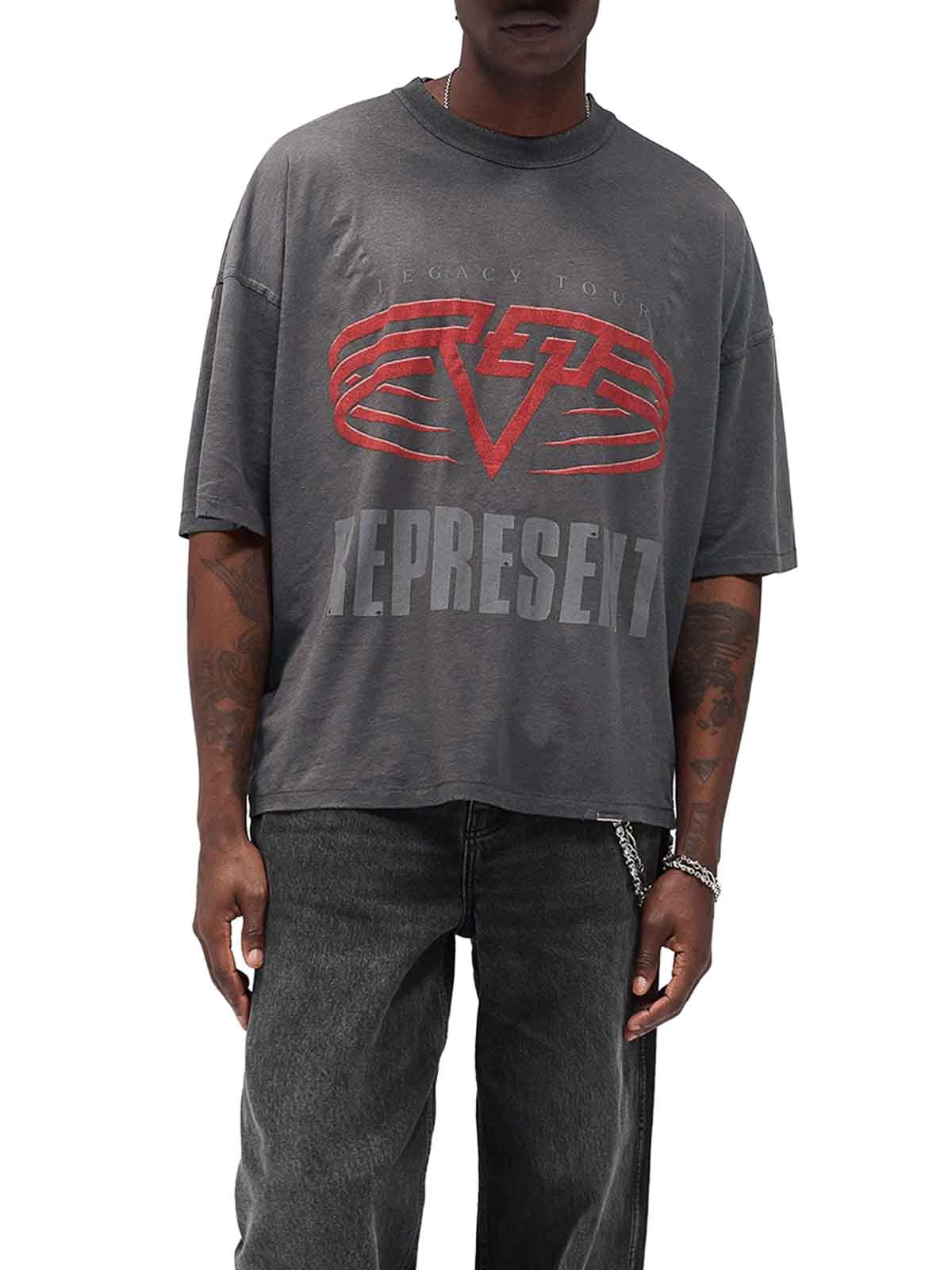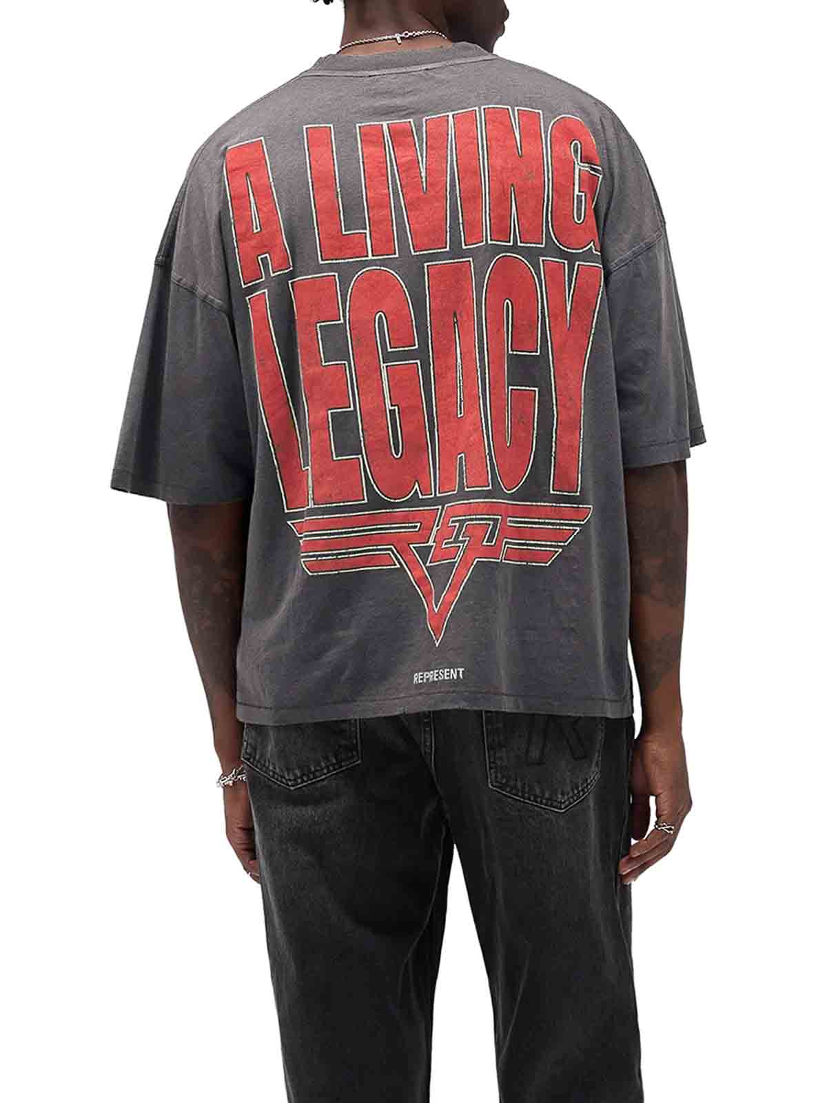 T-shirt plat réversible Living Legacy Tour blanc, coupe carrée surdimensionnée, imprimé mixte des deux côtés, finition vintage, bords légèrement vieillis et bruts, barre emblématique à l'ourlet, étiquettes amovibles pour un port bidirectionnel, gris délavé