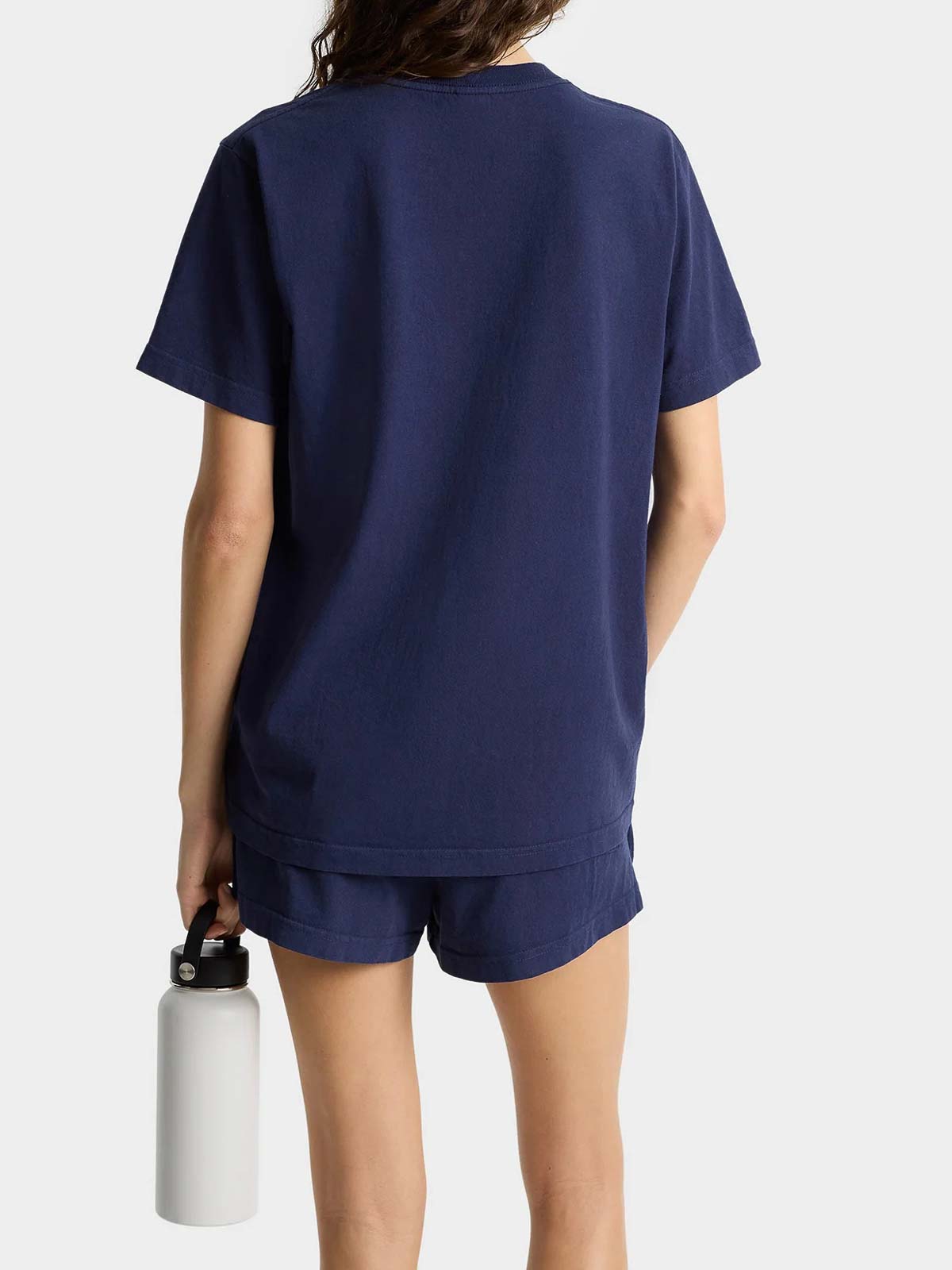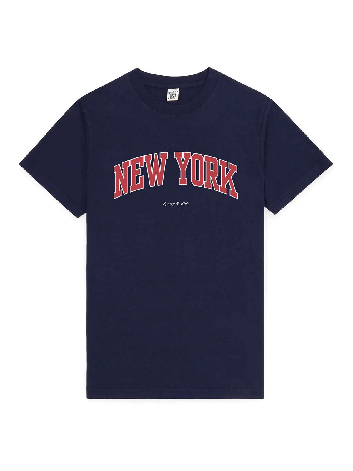 Le t-shirt Sporty & Rich en bleu marine foncé avec imprimé New York, un vêtement emblématique qui allie style urbain et confort, offre une coupe confortable et douce et des graphismes doux sur la poitrine ajoutent une touche de personnalité, ce qui le rend parfait pour un look décontracté plein de caractère.