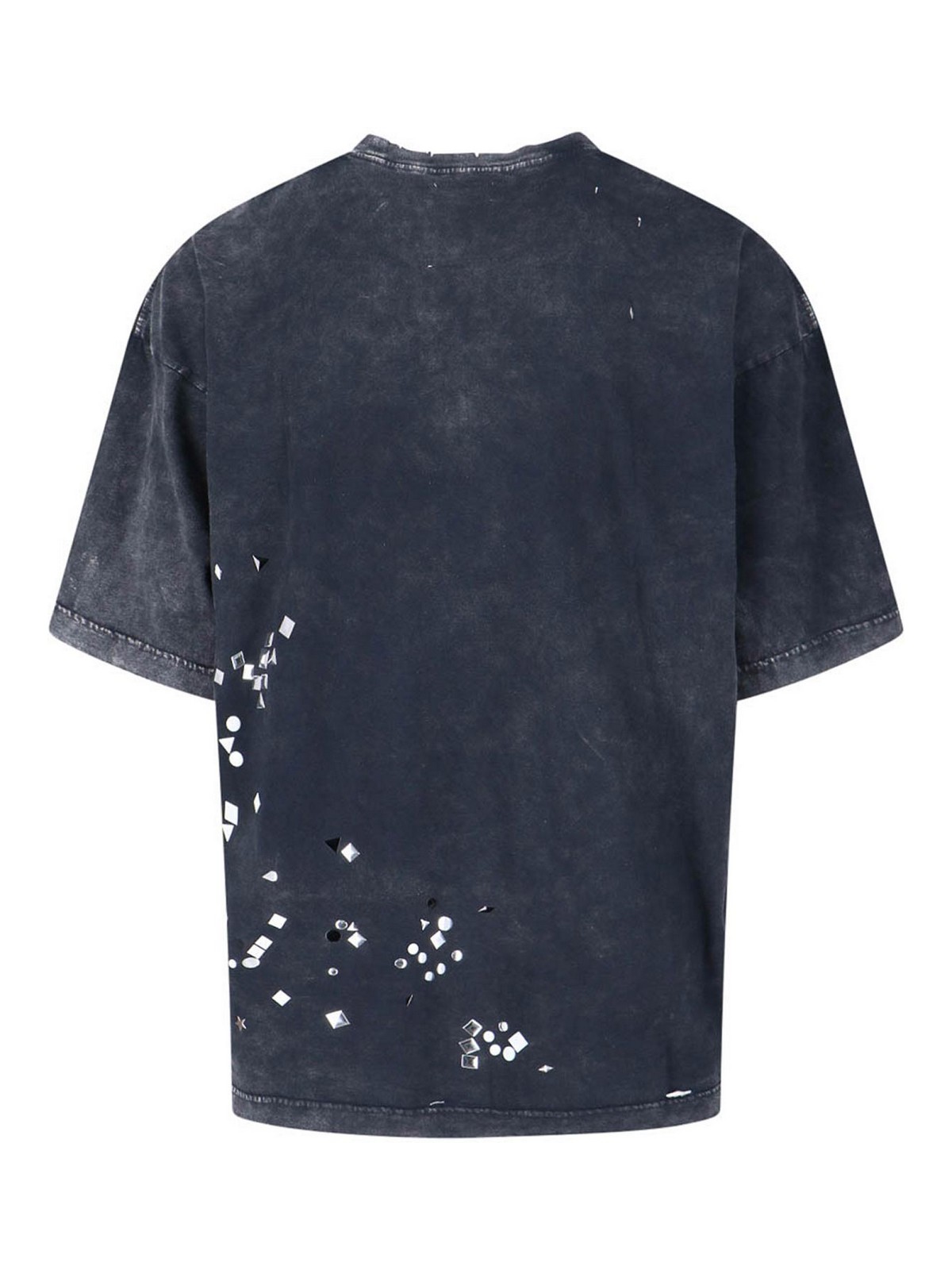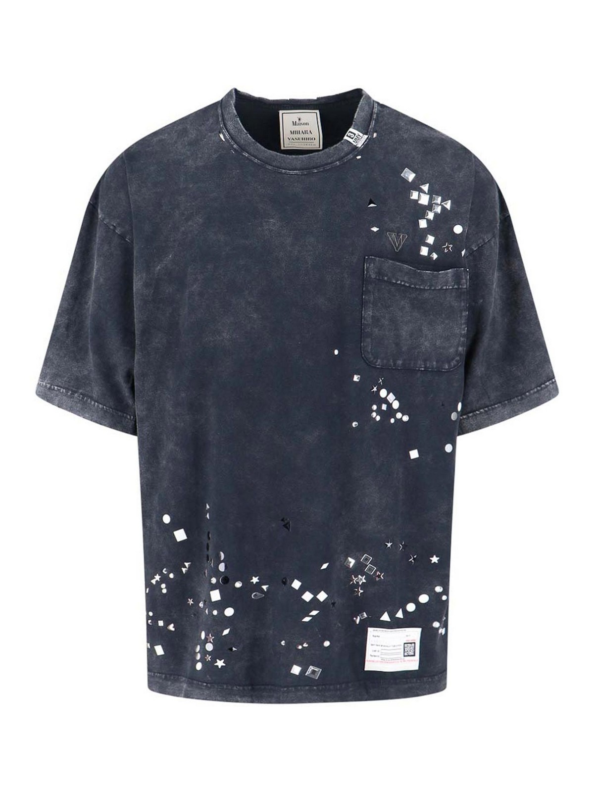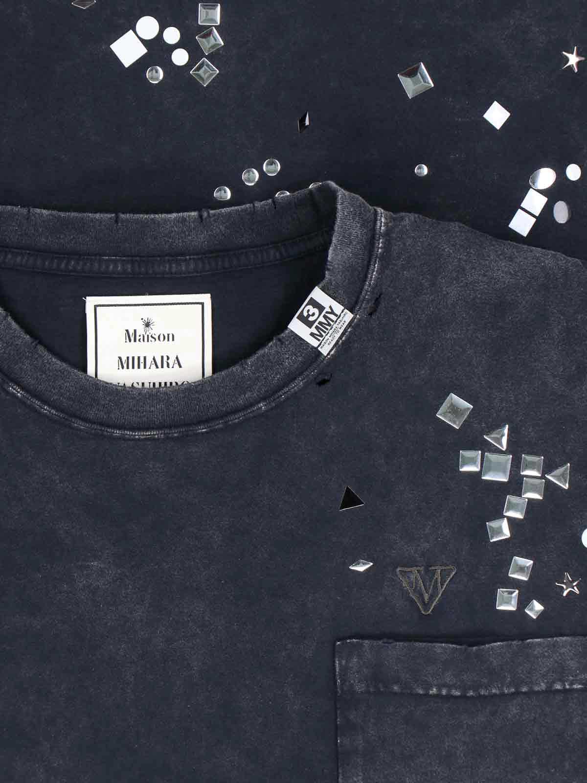 T-shirt à logo avec clous Maison Mihara Yasuhiro, en coton gris, délavé usé, détail d'usure sur le dessus, col rond, finitions côtelées, étiquette logo supérieure et inférieure, manches courtes, épaules tombantes, imprimé sur le devant, poche poitrine, ourlet droit.