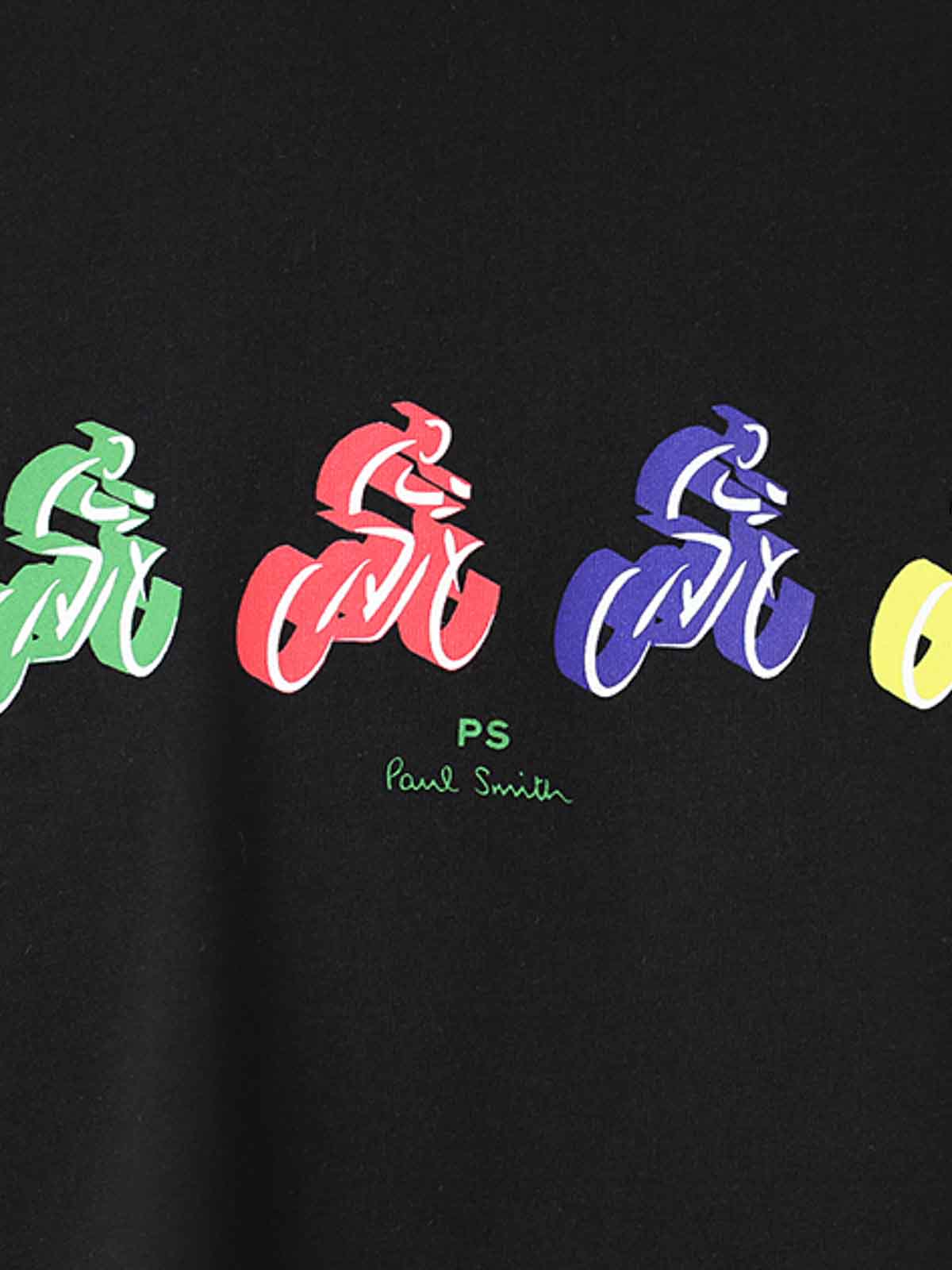 T-shirt imprimé Bike Repeat en noir, t-shirt d'équipage à manches ras du cou, caractérisé par l'imprimé multicolore Bike Repeat, accompagné du logo officiel PS dans le col, terminé par des cibbed Manufacturers. Robe au-dessus de l'encolure de religieuses aux manches côtelées, imprimé à la presse, logo Paul Smith, impression frontale, répétition du vélo, couleur noire organique multicolore