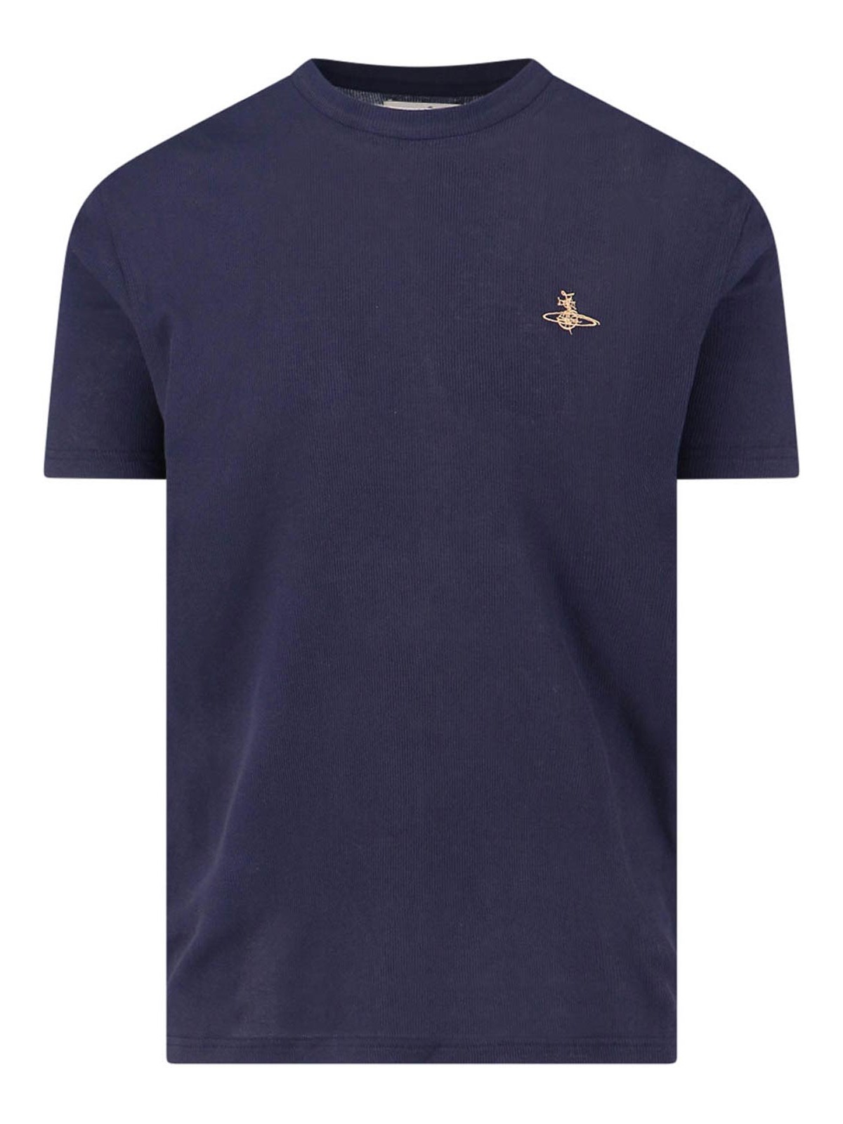 T-shirt à logo orbe Vivienne Westwood, en coton bleu, teinte bleu marine, maille côtelée, col rond, manches courtes, logo orb brodé contrastant sur la poitrine, ourlet droit.