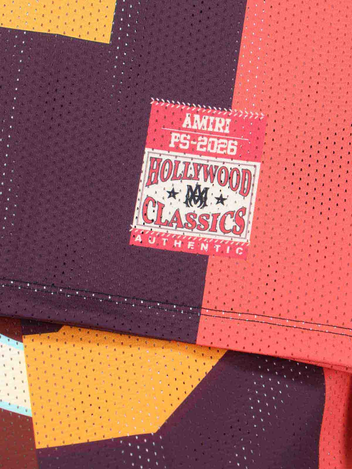 T-shirt épissé Amiri en maille rouge, col en V, manches courtes, épaules tombantes, imprimé épissé intégral, ourlet droit.
