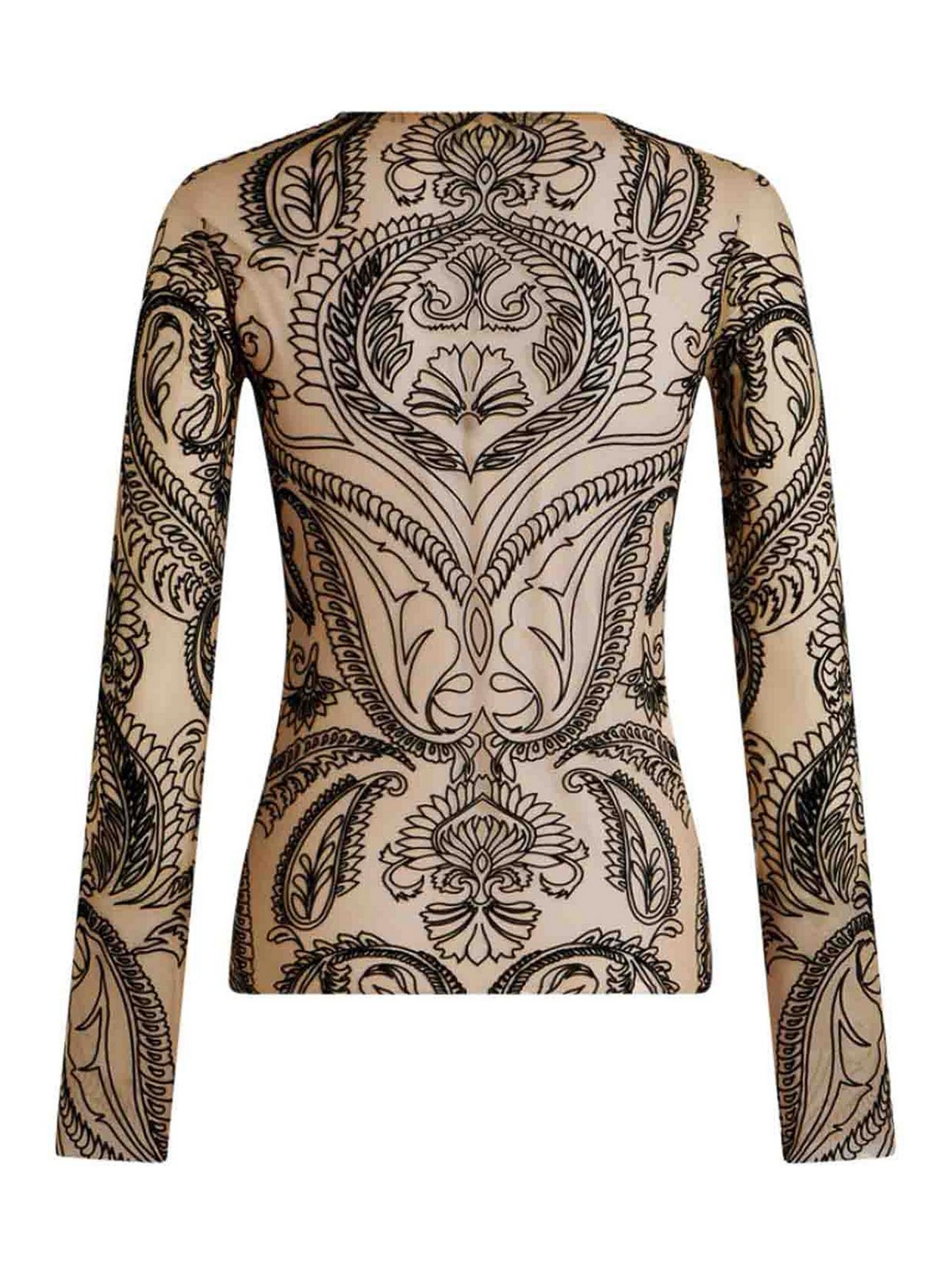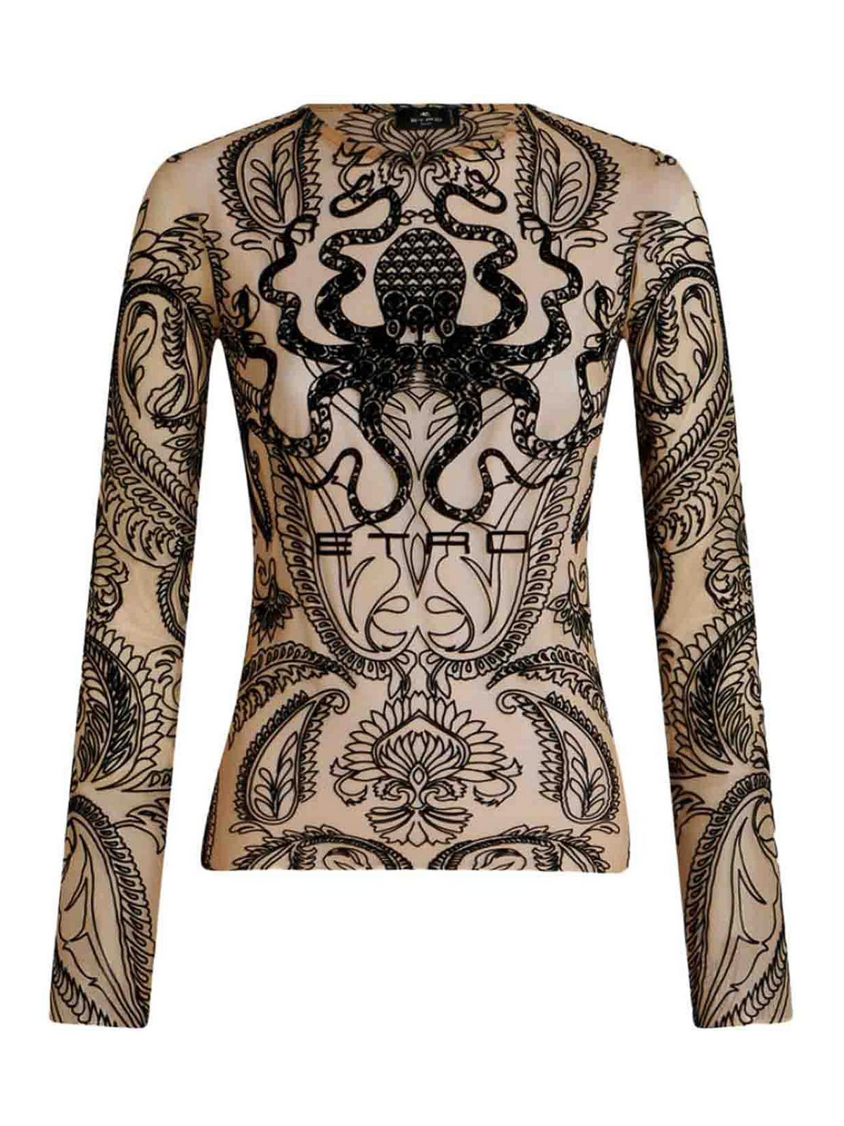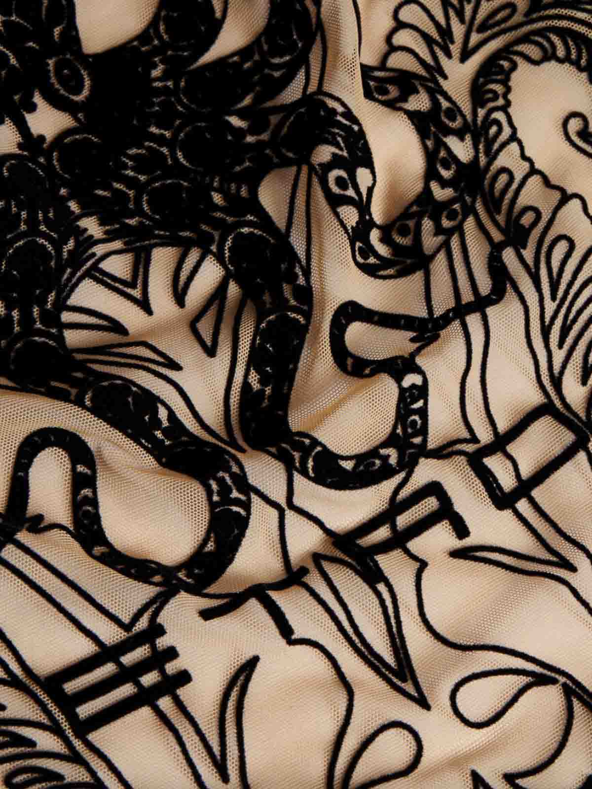 Top ajusté en tulle stretch floqué avec double motif inspiré du poulpe en tulle superposé à effet transparent, coupe ajustée, col rond, manches longues