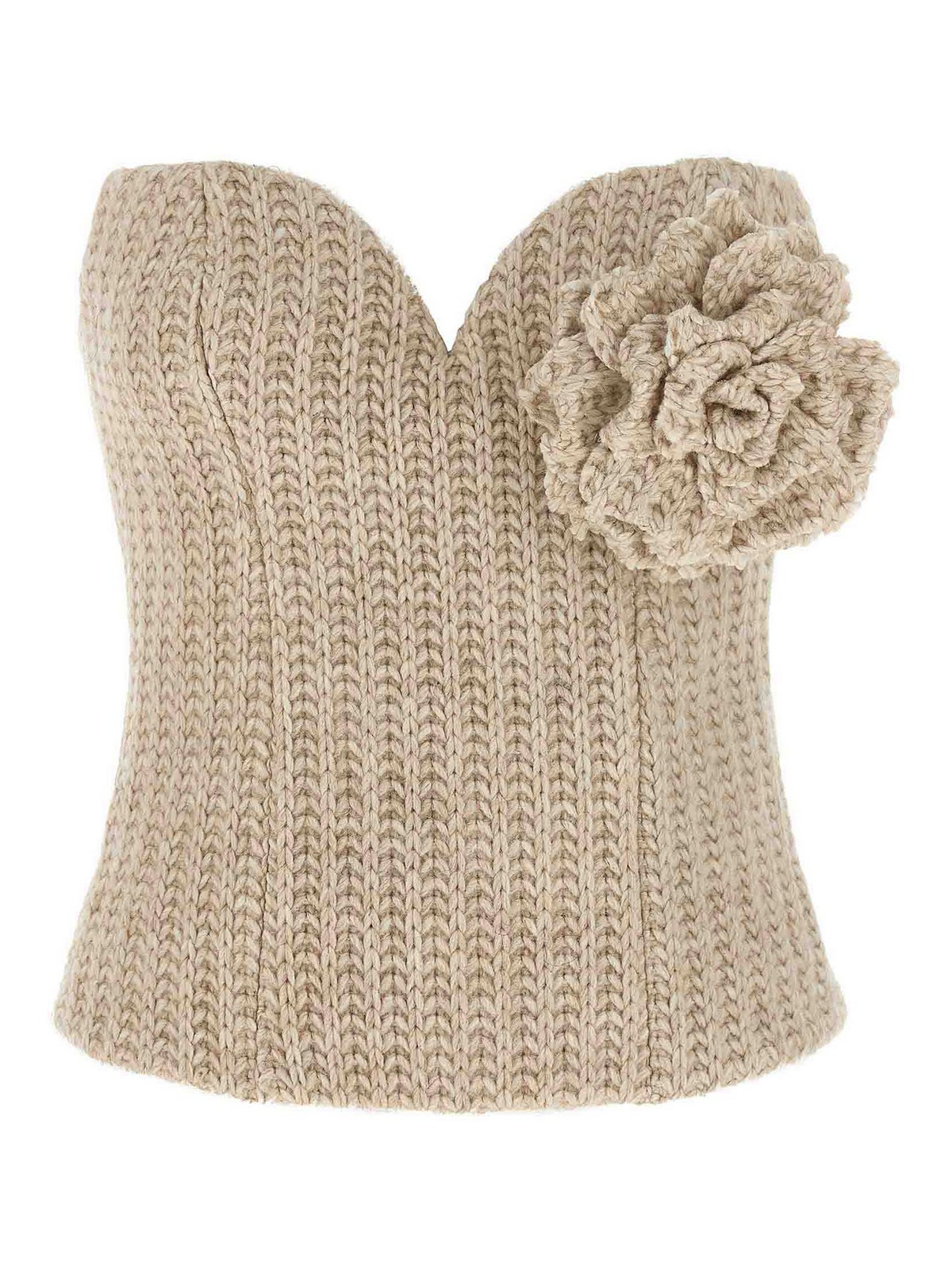 Haut en mélange de viscose, laine et alpaga tricoté, style bustier à épaules dénudées avec bonnets préformés et attelles intérieures, broche assortie amovible, encolure en cœur, sans manches, fermeture zippée au dos.