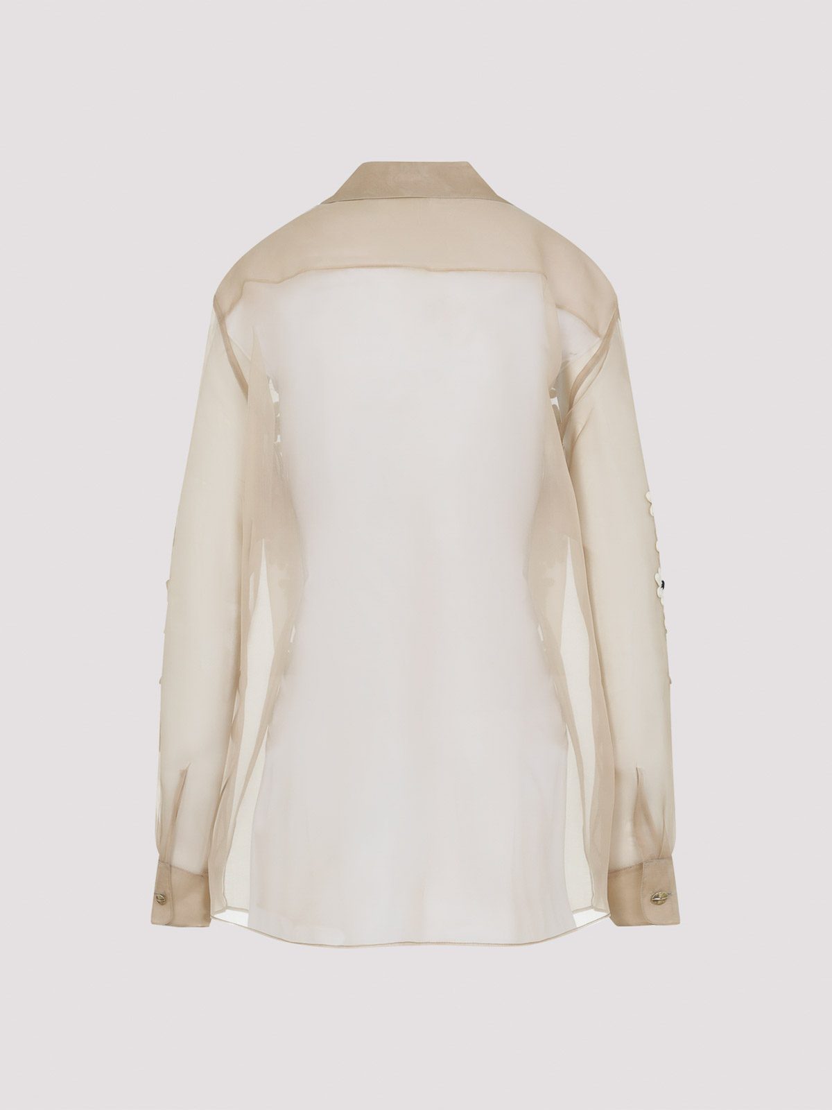 Haut en soie beige Khaite Argo. Chemise confectionnée en organza de soie beige, ornée de broderies florales appliquées à la main sur l'ensemble, d'un col pointu, d'une fermeture boutonnée sur le devant, de manches longues avec poignets à bouton unique, d'un empiècement arrière, d'un ourlet rond et d'une coupe décontractée.