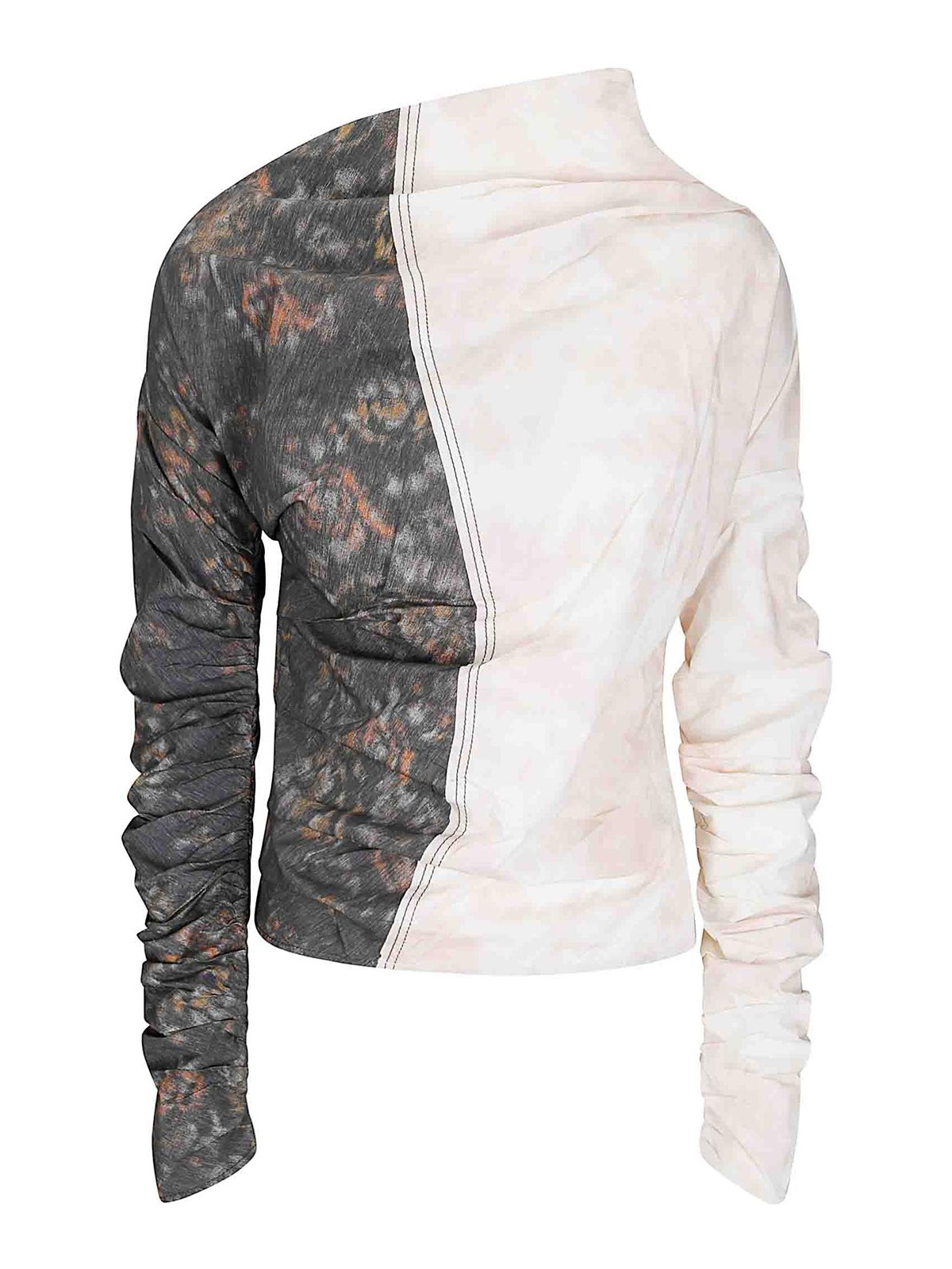 Top en tissu stretch à panneaux, surpiqûres contrastantes, coupe cintrée, col haut, drapé.