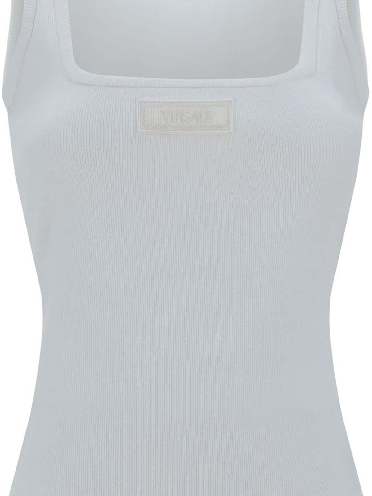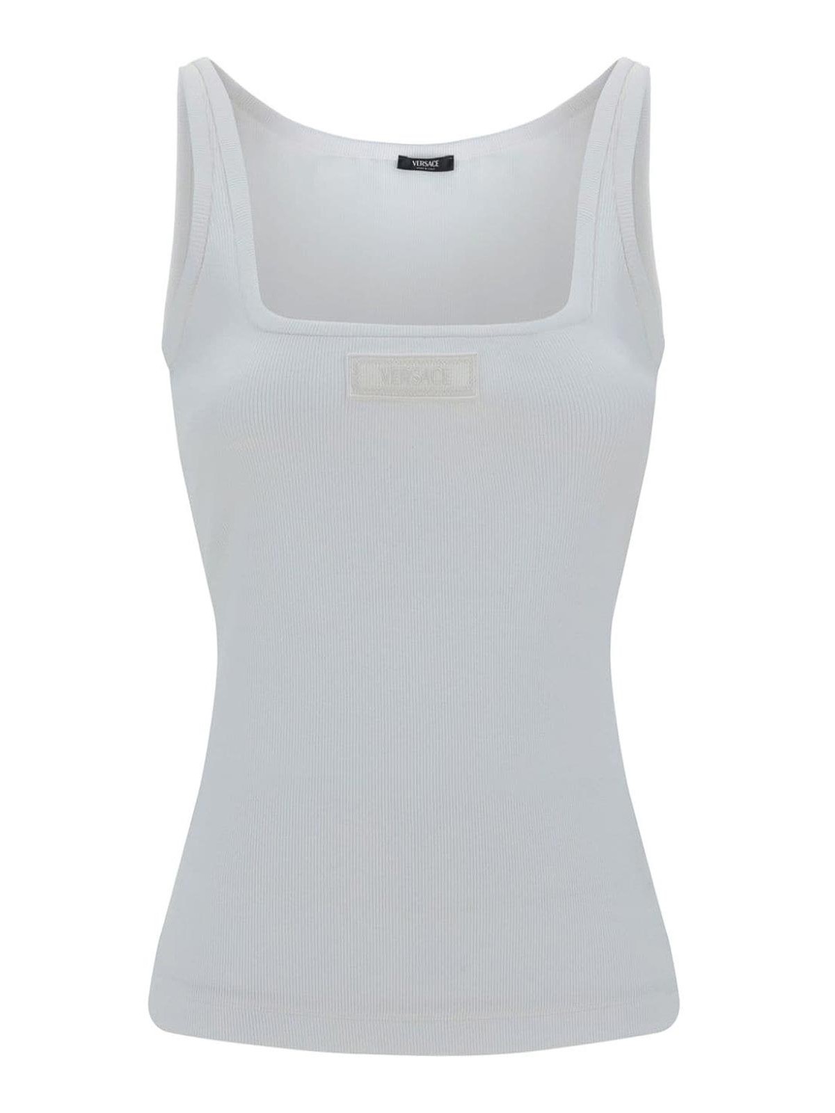 Améliorez votre look avec ce haut sans manches Versace blanc optique orné d'une délicate texture côtelée, d'un logo appliqué, d'une encolure carrée et d'un ourlet droit. Ce haut est idéal pour la mode, la femme avant-gardiste, haut sans manches Versace, blanc optique, texture côtelée délicate, logo appliqué, encolure carrée, ourlet droit