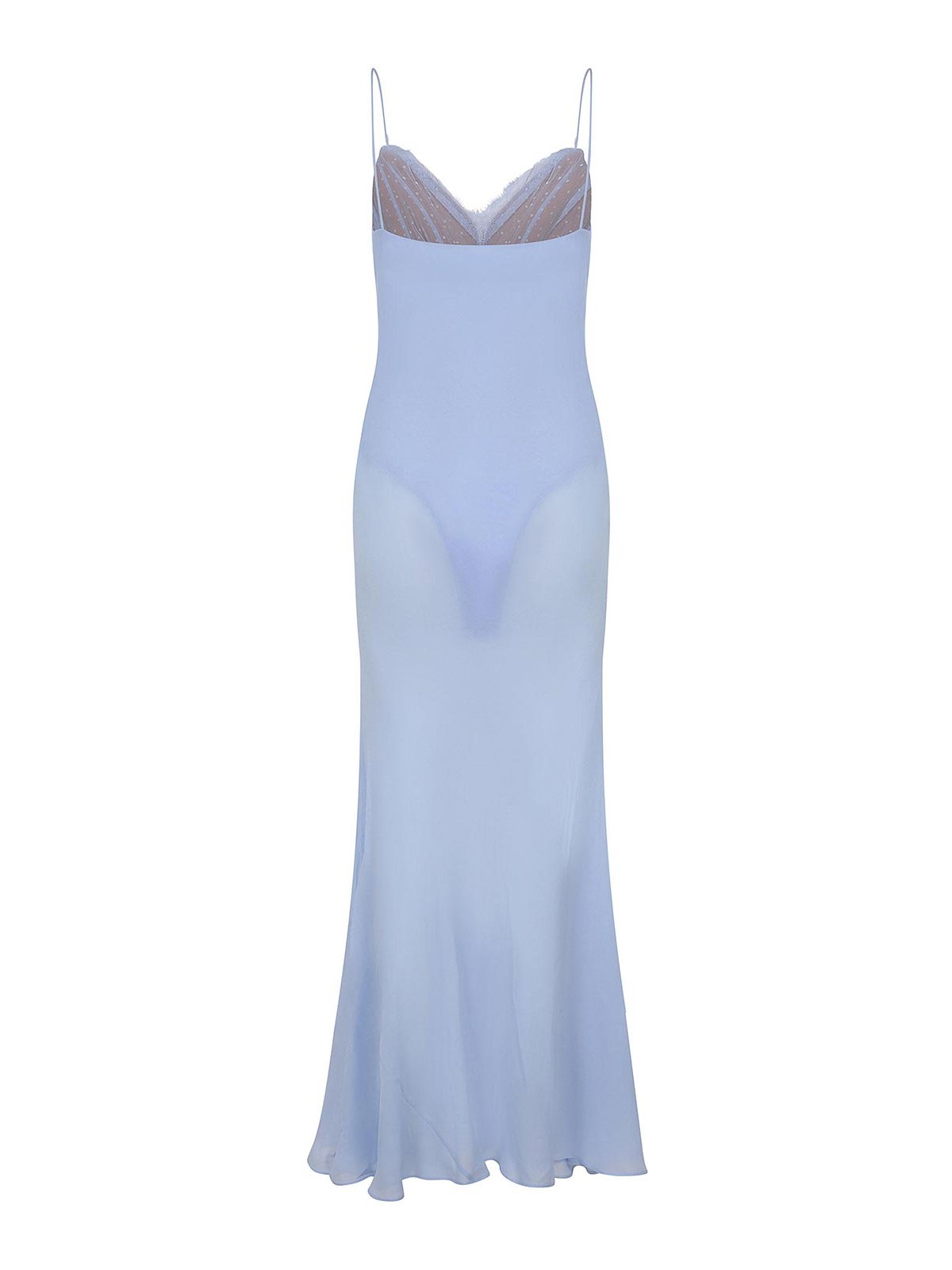Robe d'autoportrait en viscose bleu clair. Col en V. fines bretelles. Détails en dentelle sur la poitrine. nœud contrasté sur le devant. fermeture du corps par crochets. 100 % viscose.