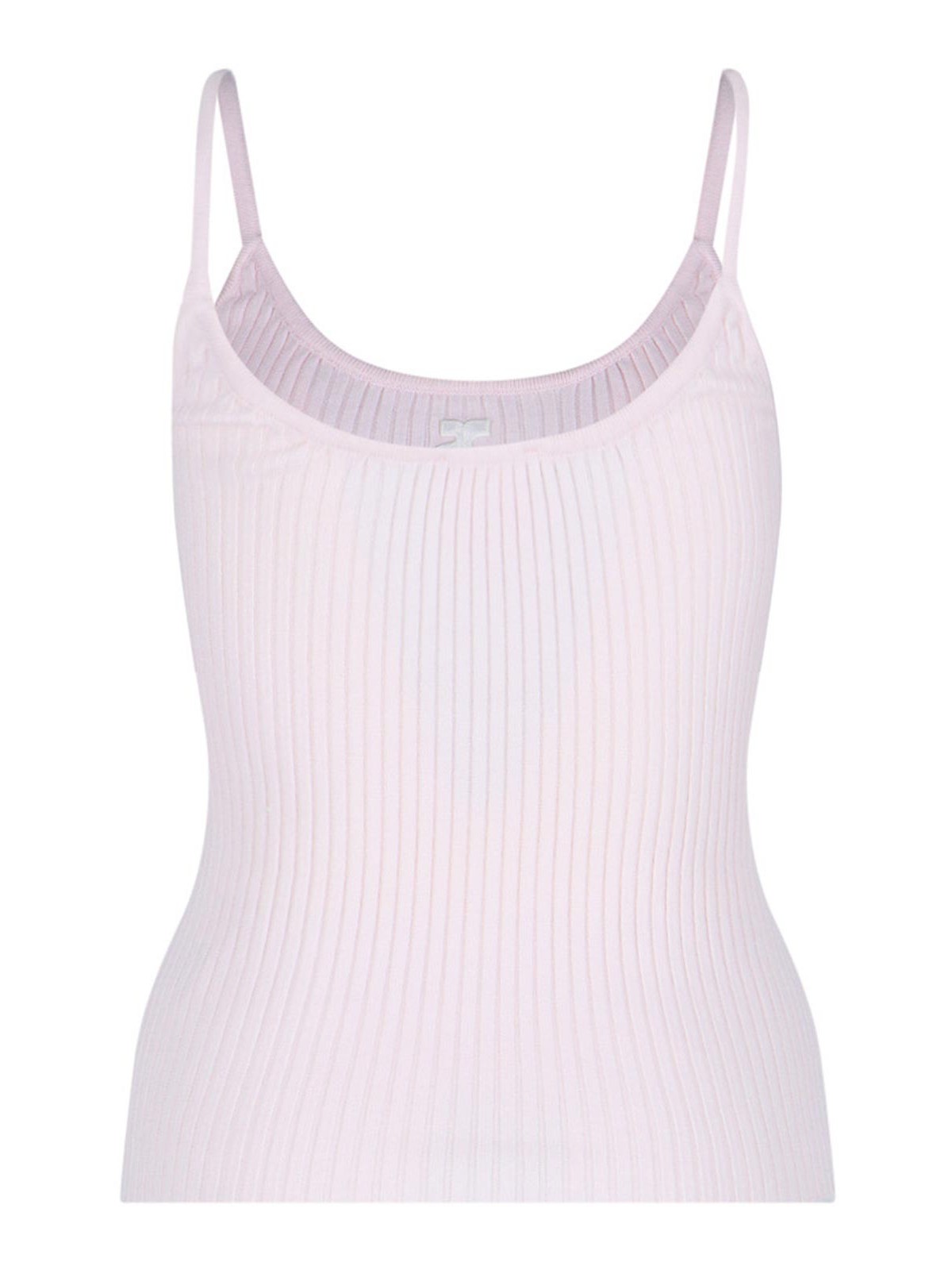 Top à logo Courrèges, rose, fines bretelles, encolure ronde, détail brodé du logo blanc sur le devant, ourlet droit.