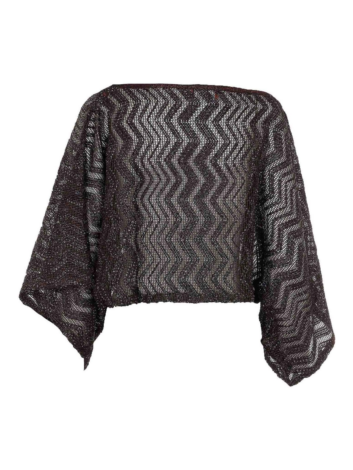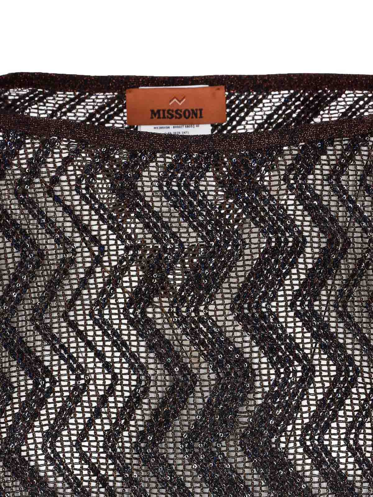 Top à paillettes marron foncé Missoni, col bateau, maille, effet transparent, détails en sequins