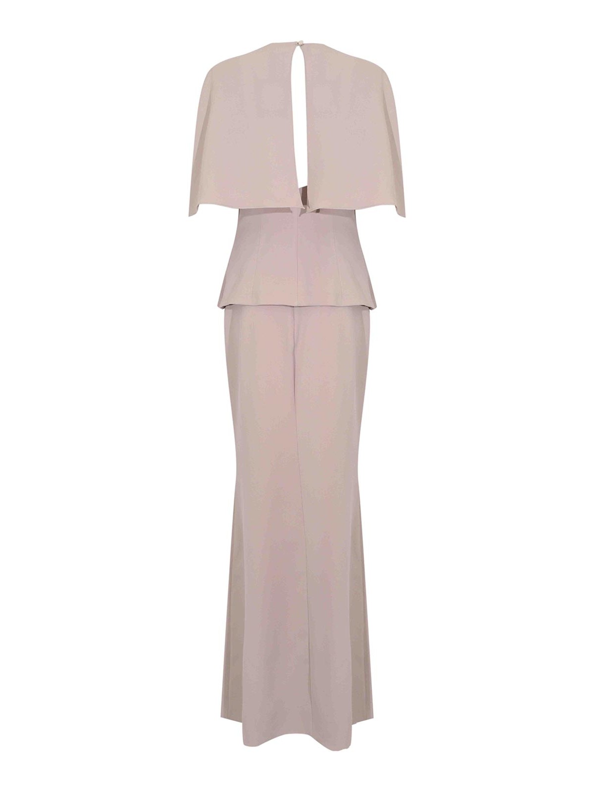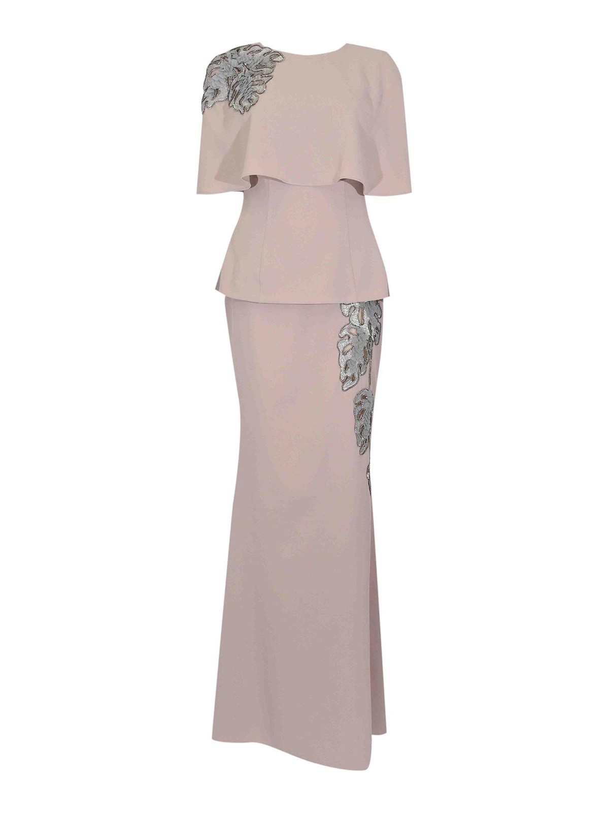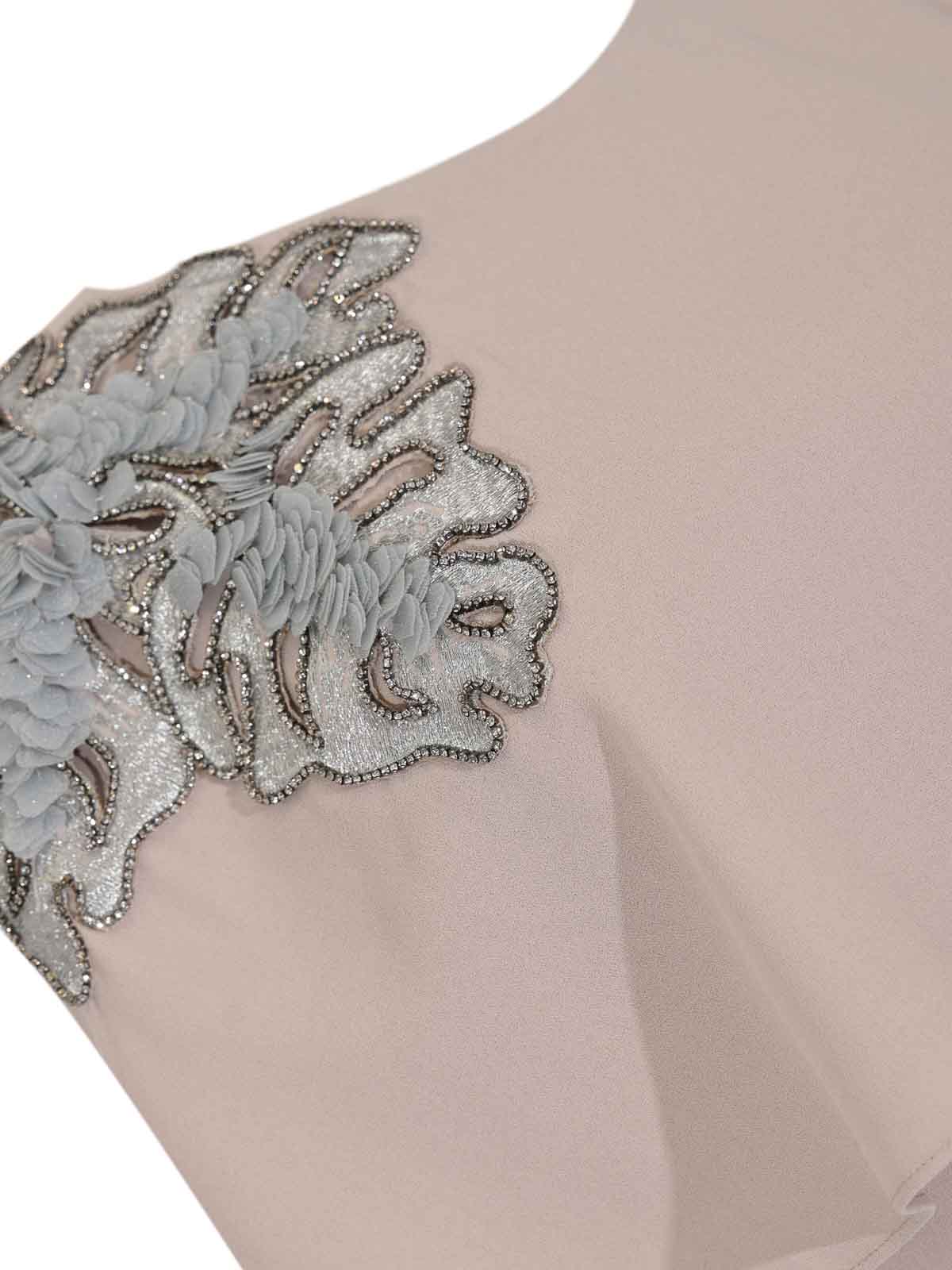 Robe en crêpe pour femme, Tarik Ediz, modèle Lizzy 66648, tissu : crêpe, motif : couleur unie, manches : style cape courte, col : col rond, fermeture : fermeture : fermeture éclair arrière avec ouverture en forme de larme, poches : absentes, détails : applications florales avec strass et broderies sur l'épaule et la jupe, modèle en deux pièces avec dessus superposé à effet cape, doublure : s, coupe : normale