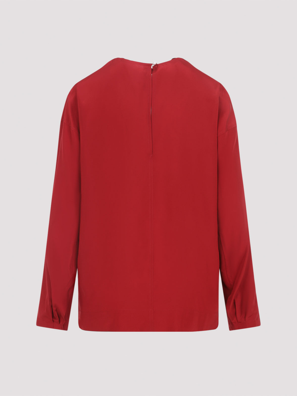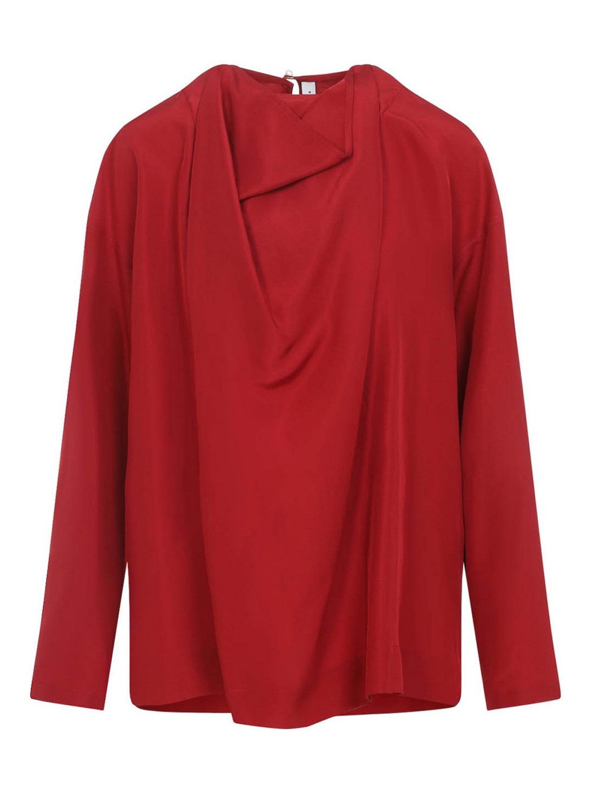 Haut en soie rouge drapée Carven. Blouse en soie rouge, dotée d'une encolure drapée sur le devant, de manches longues, d'une découpe avec fermeture boutonnée dans le dos et d'une coupe décontractée.