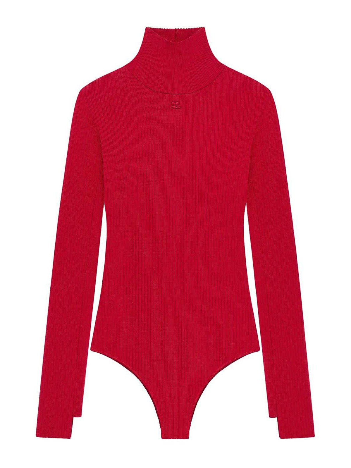 Fabrication en tricot côtelé rouge, col montant, manches longues, logo brodé