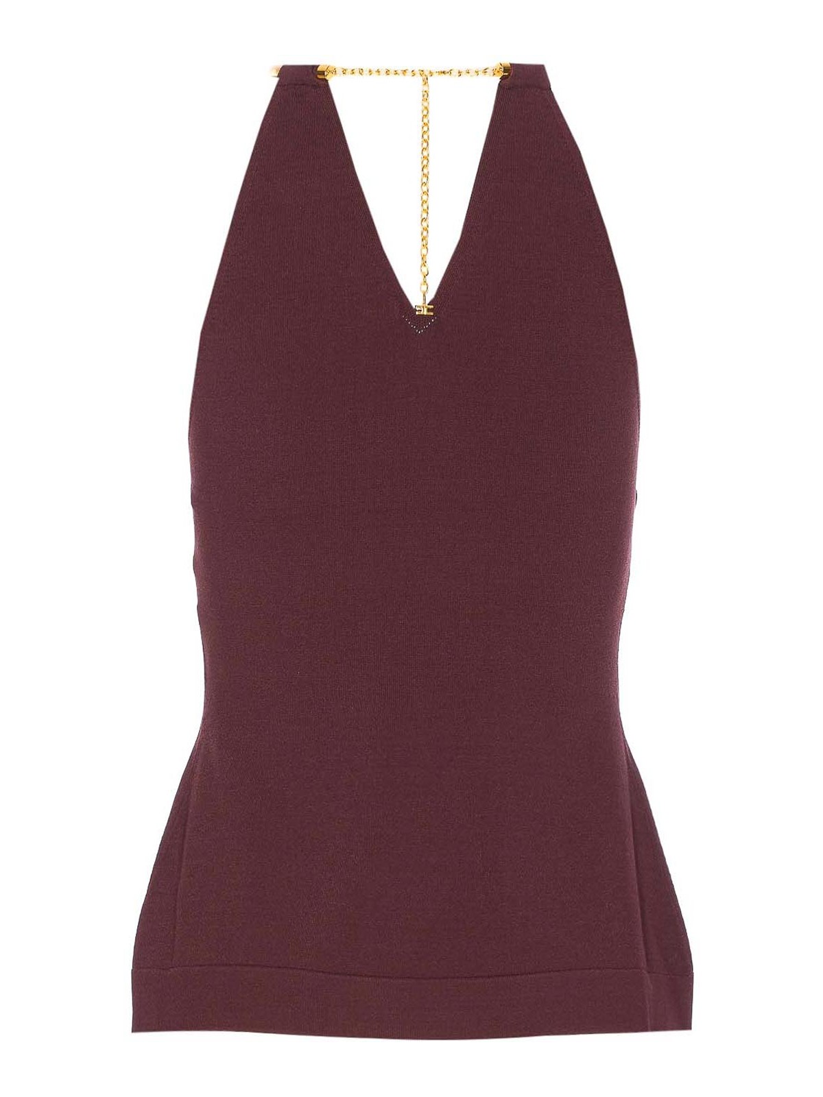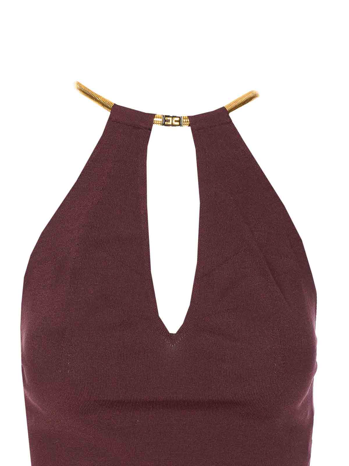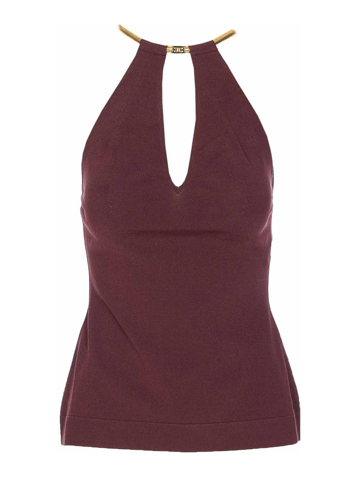 Top bordeaux Elisabetta Franchi, collier avec logo en plaque, détail découpé sur le devant, sans manches