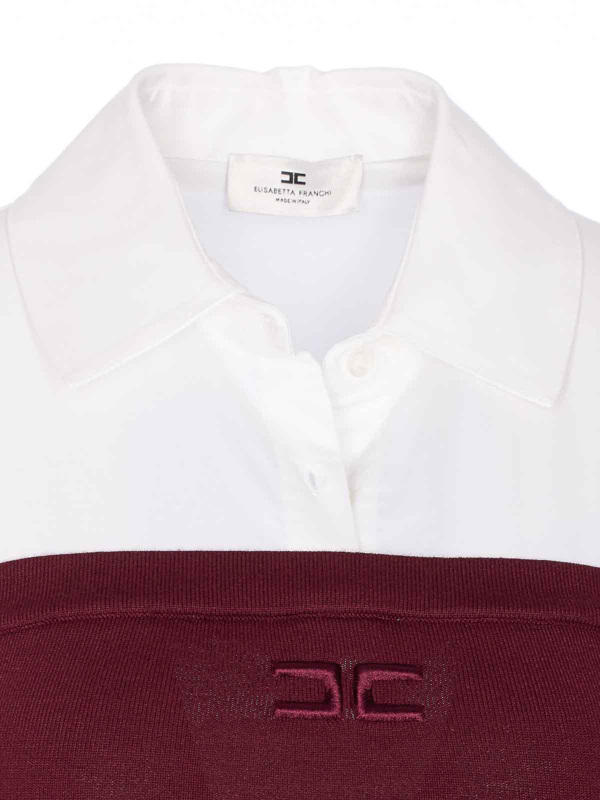 Elisabetta Franchi blanche et rouge, col régulier, manches longues, boutons siglés sur les poignets, fermeture à boutons, logo brodé sur le devant