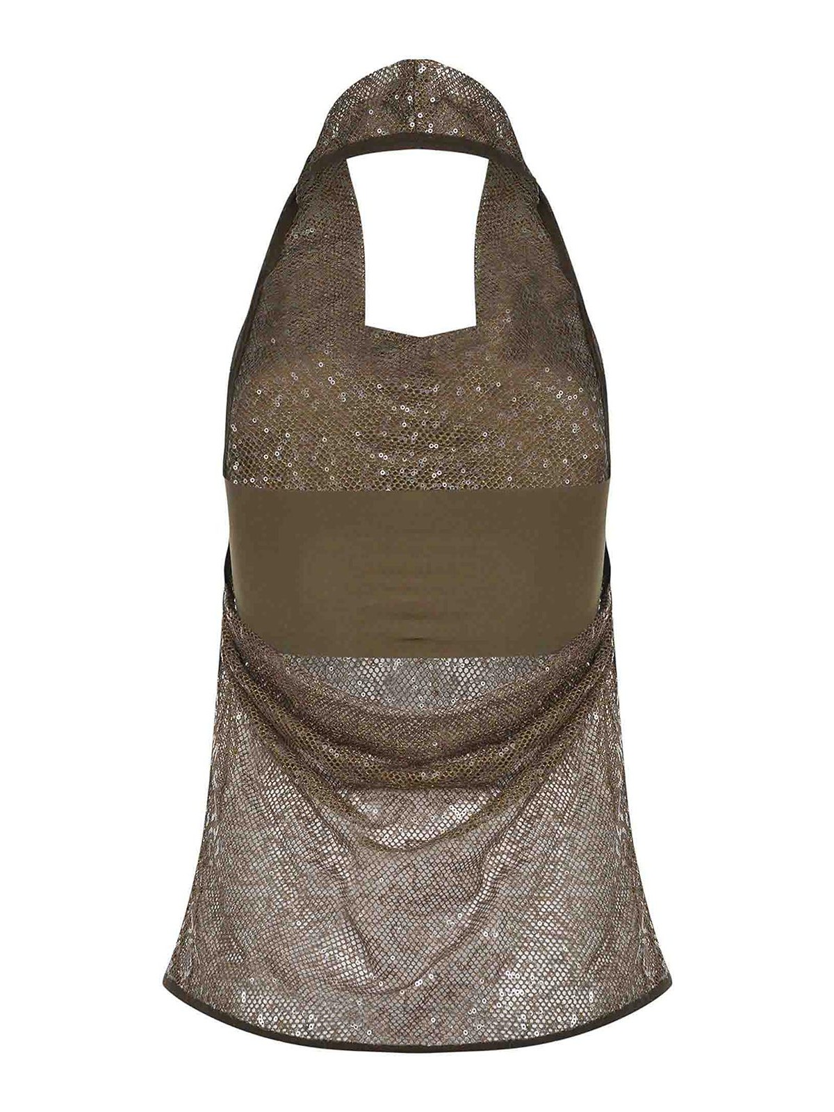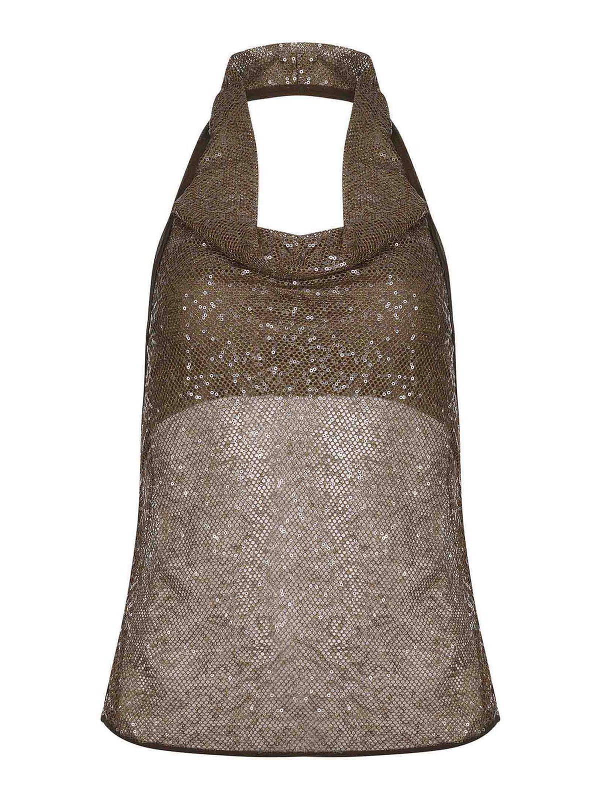 Top Pinko Thank You Olive, sans manches, encolure souple depuis le cou, entièrement transparent avec sequins, bretelle amovible, encolure profonde, dos en fibres