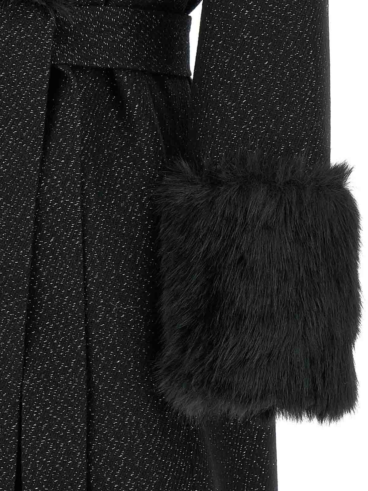 Manteau à double boutonnage en tissu tissé avec fil d'agneau avec fermeture boutonnée sur le devant, col à revers avec insert amovible en tissu effet fourrure, poches passepoilées, manches longues avec insert amovible en tissu effet fourrure, étiquette logo en métal et fente arrière, doublure en nylon matelassé, ceinture amovible.