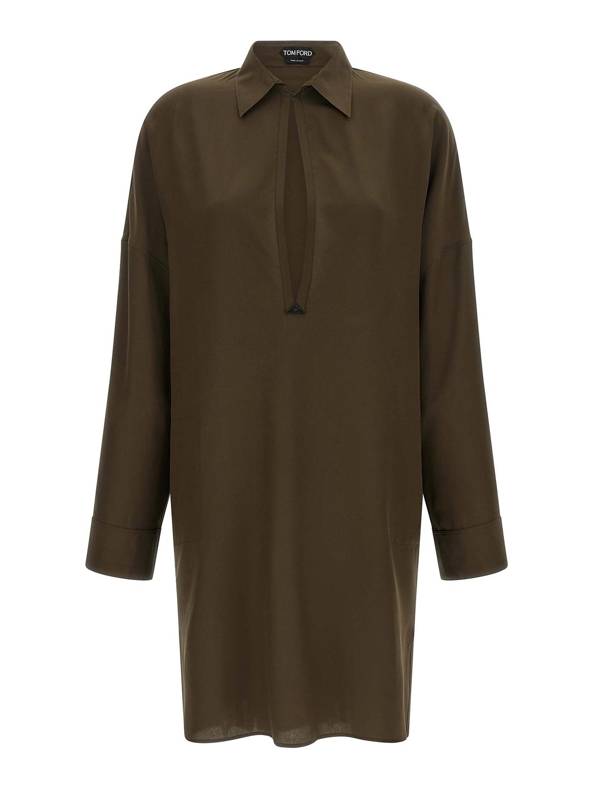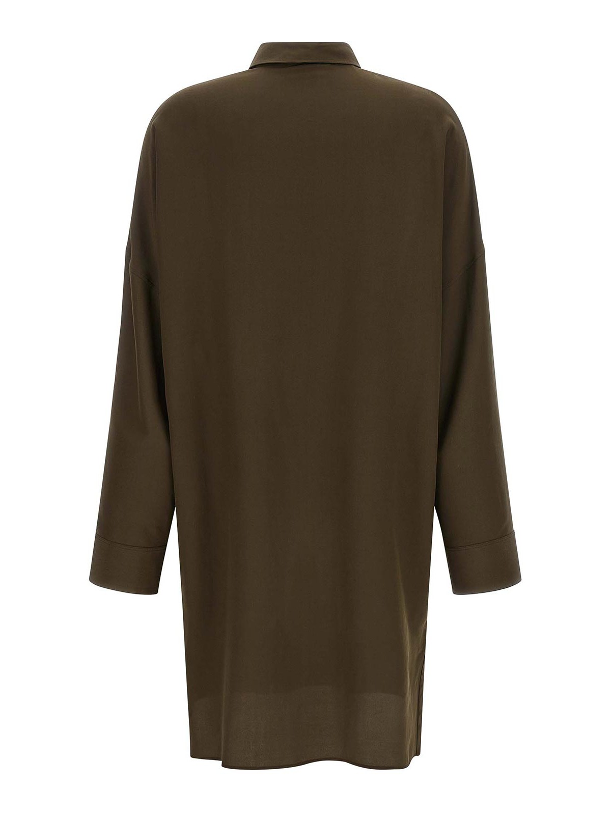 Robe midi tunique en crêpe de Chine avec détails en cuir lisse ton sur ton, col chemise avec fermeture à crochet et découpe sur le devant, manches longues à revers, fentes latérales et ourlet asymétrique.