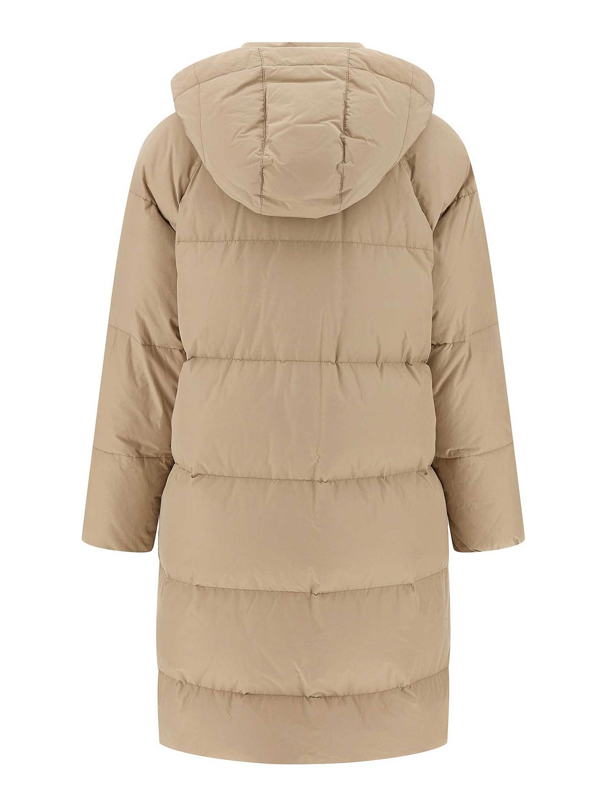 Veste longue en tissu technique matelassé, rembourrée d'oie hydrofuge, capuche amovible, col de chemise, fermeture éclair avec fermeture éclair « brillante », fermeture éclair monile et poches à boutons-pression, manches longues avec poignets élastiques, cordon de serrage à l'ourlet