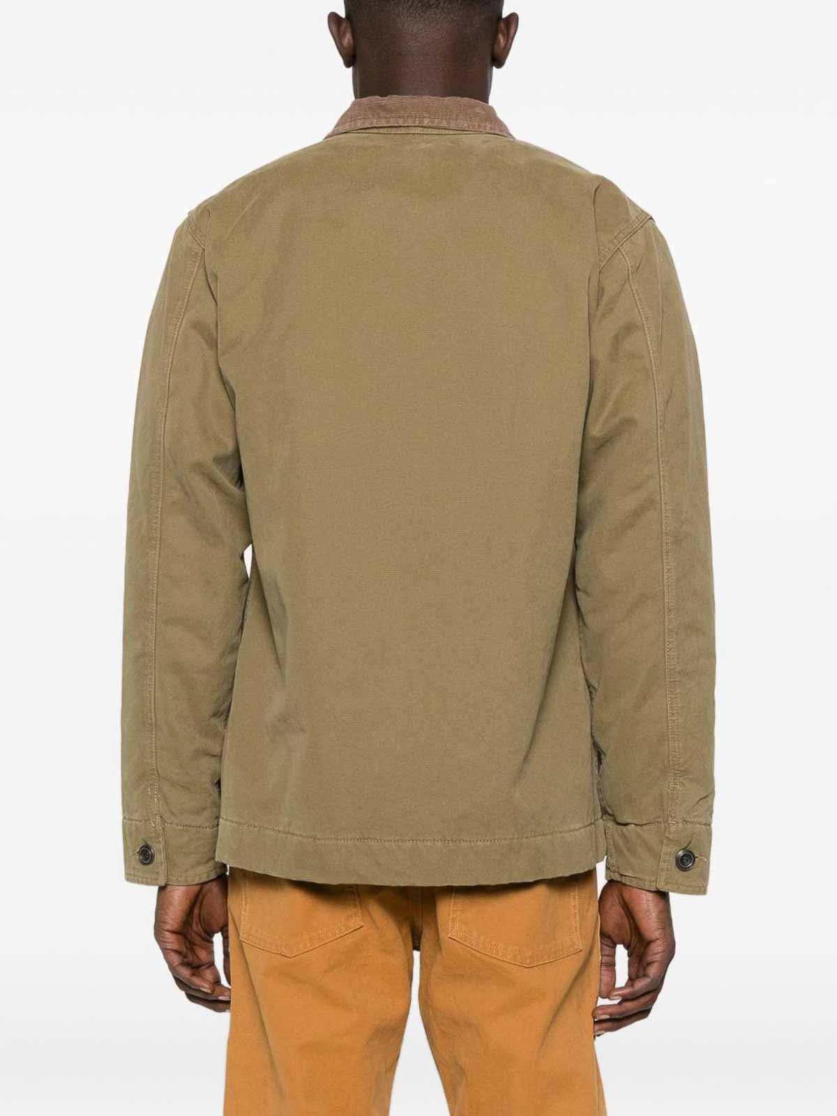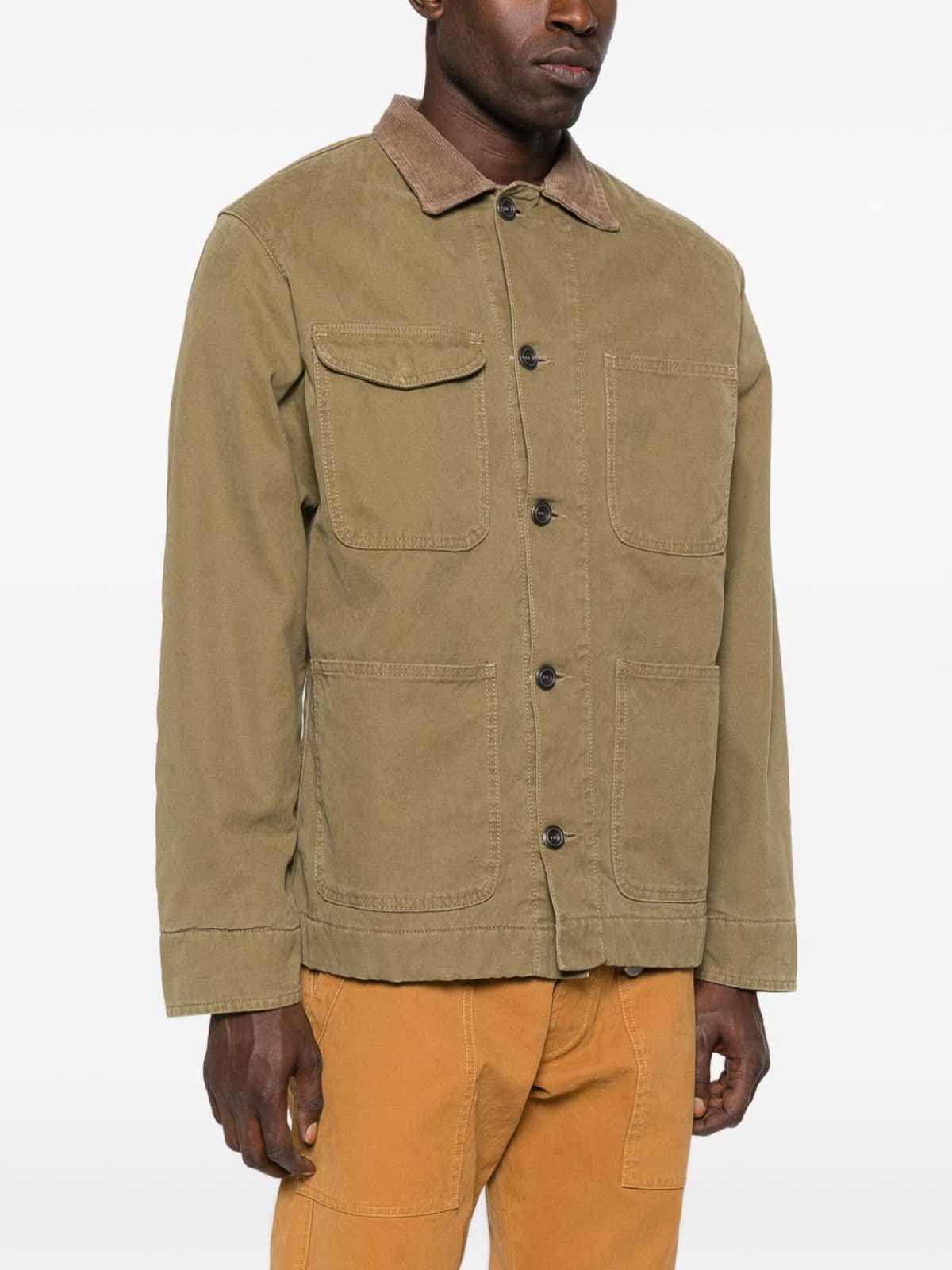 Col en velours côtelé marron, fermeture boutonnée sur le devant, poches multiples, manches longues, ourlet droit